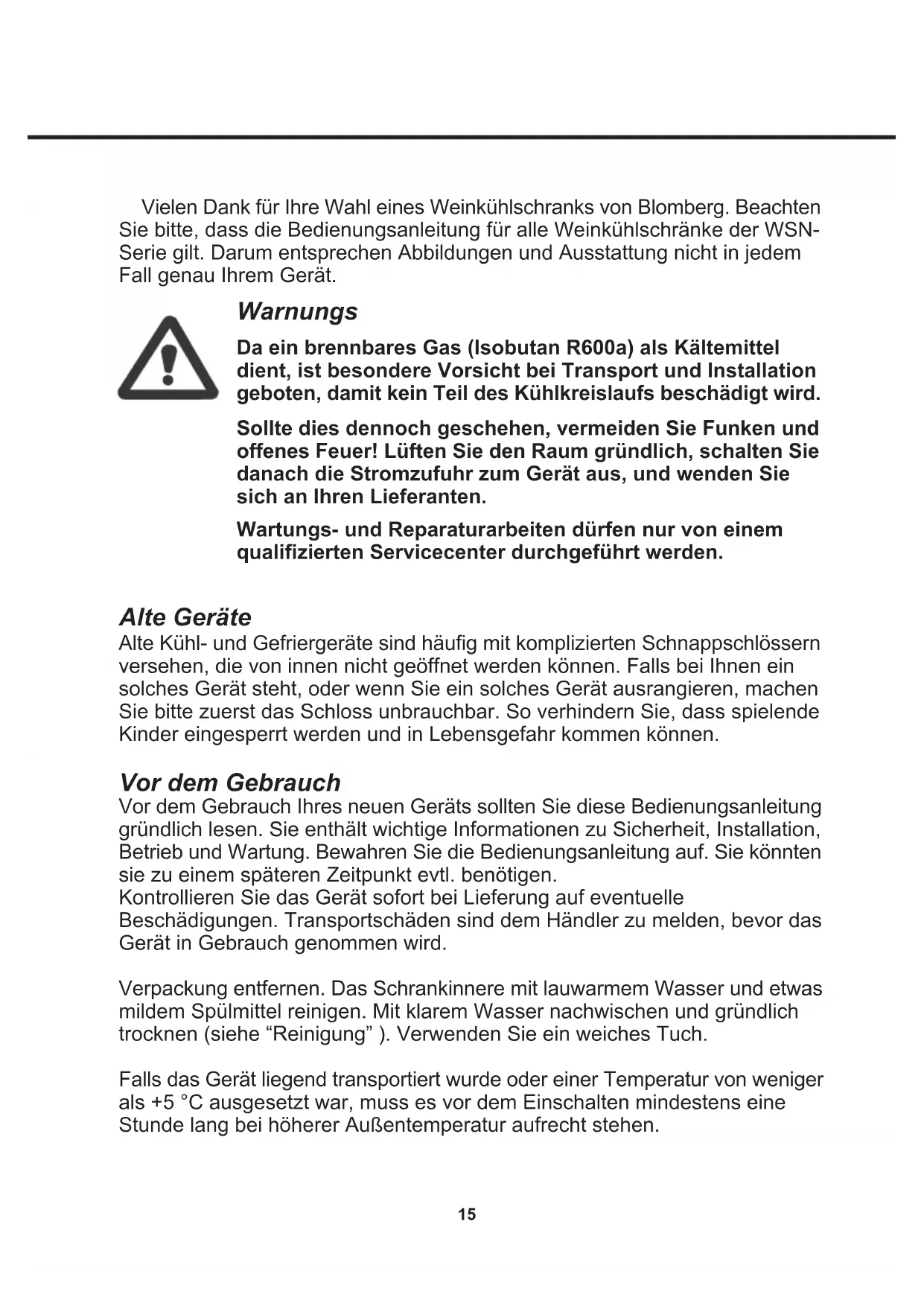 Warranty, spare parts and service14 Environmental regulations on disposal must also be observed. When disposing of the appliance you should contact your local authority technical department who will inform you of how collection and recycling of such units take place in your area. This appliance is marked according to the European directive 2002/96/EC on Waste Electrical and Electronic Equipment (WEEE). By ensuring this product is disposed of correctly, you will help prevent potential negative consequences for the environment and human health, which could otherwise be caused by inappropriate waste handling of this product. The symbol on the product, or on the documents accompanying the product, indicates that this appliance may not be treated as household waste. Instead it shall be handed over to the applicable collection point for the recycling of electrical and electronic equipment. Disposal must be carried out in accordance with local environmental regulations for waste disposal. For more detailed information about treatment, recovery and recycling of this product, please contact your local city office, your household waste disposal service or the shop where you purchased the product. Disposal15 Vielen Dank für Ihre Wahl eines Weinkühlschranks von Blomberg. Beachten Sie bitte, dass die Bedienungsanleitung für alle Weinkühlschränke der WSN- Serie gilt. Darum entsprechen Abbildungen und Ausstattung nicht in jedem Fall genau Ihrem Gerät. Warnungs Da ein brennbares Gas (Isobutan R600a) als Kältemittel dient, ist besondere Vorsicht bei Transport und Installation geboten, damit kein Teil des Kühlkreislaufs beschädigt wird. Sollte dies dennoch geschehen, vermeiden Sie Funken und offenes Feuer! Lüften Sie den Raum gründlich, schalten Sie danach die Stromzufuhr zum Gerät aus, und wenden Sie sich an Ihren Lieferanten. Wartungs- und Reparaturarbeiten dürfen nur von einem qualifizierten Servicecenter durchgeführt werden. Alte Geräte Alte Kühl- und Gefriergeräte sind häufig mit komplizierten Schnappschlössern versehen, die von innen nicht geöffnet werden können. Falls bei Ihnen ein solches Gerät steht, oder wenn Sie ein solches Gerät ausrangieren, machen Sie bitte zuerst das Schloss unbrauchbar. So verhindern Sie, dass spielende Kinder eingesperrt werden und in Lebensgefahr kommen können. Vor dem Gebrauch Vor dem Gebrauch Ihres neuen Geräts sollten Sie diese Bedienungsanleitung gründlich lesen. Sie enthält wichtige Informationen zu Sicherheit, Installation, Betrieb und Wartung. Bewahren Sie die Bedienungsanleitung auf. Sie könnten sie zu einem späteren Zeitpunkt evtl. benötigen. Kontrollieren Sie das Gerät sofort bei Lieferung auf eventuelle Beschädigungen. Transportschäden sind dem Händler zu melden, bevor das Gerät in Gebrauch genommen wird. Verpackung entfernen. Das Schrankinnere mit lauwarmem Wasser und etwas mildem Spülmittel reinigen. Mit klarem Wasser nachwischen und gründlich trocknen (siehe “Reinigung” ). Verwenden Sie ein weiches Tuch. Falls das Gerät liegend transportiert wurde oder einer Temperatur von weniger als +5 °C ausgesetzt war, muss es vor dem Einschalten mindestens eine Stunde lang bei höherer Außentemperatur aufrecht stehen.16 Lernen Sie Ihren Kühlschrank kennen Beleuchtung Kohlefilter Holzfach Dichtleiste Typenschild Türgriff Fußleiste Bedienungselemente Schloss Einstellbare Füße Abb. 117 Aufstellort Aus Sicherheits- und betriebstechnischen Gründen darf das Gerät nicht im Freien aufgestellt werden. Stellen Sie den Schrank auf einen ebenen Untergrund in einem trockenen, gut belüfteten Raum (max. 75 % relative Luftfeuchtigkeit). Stellen Sie den Schrank nicht in unmittelbarer Nähe von Wärmequellen wie Herden oder Heizkörpern auf, und vermeiden Sie direkte Sonneneinstrahlung oder Wärme von anderen Wärmequellen. Raumtemperatur Die Klimaklasse finden Sie auf dem Typenschild (siehe Abb. 1 Seite 16 und Abb. 11 Seite 26). Sie gibt an, innerhalb welcher Raumtemperaturbereiche der Kühlschrank optimal arbeitet. Weinschränke mit Winterposition fungieren bis zu einer Raumtemperatur von 5 °C. Installation Die Unterlage zum Aufstellen des Schranks muss eben sein. Verwenden Sie keinen Rahmen o.ä. Der Schrank kann frei an einer Wand stehen, in ein Küchenelement eingebaut werden oder neben anderen Schränken aufgestellt werden (Abb. 2-3). Inbetriebnahme und Installation