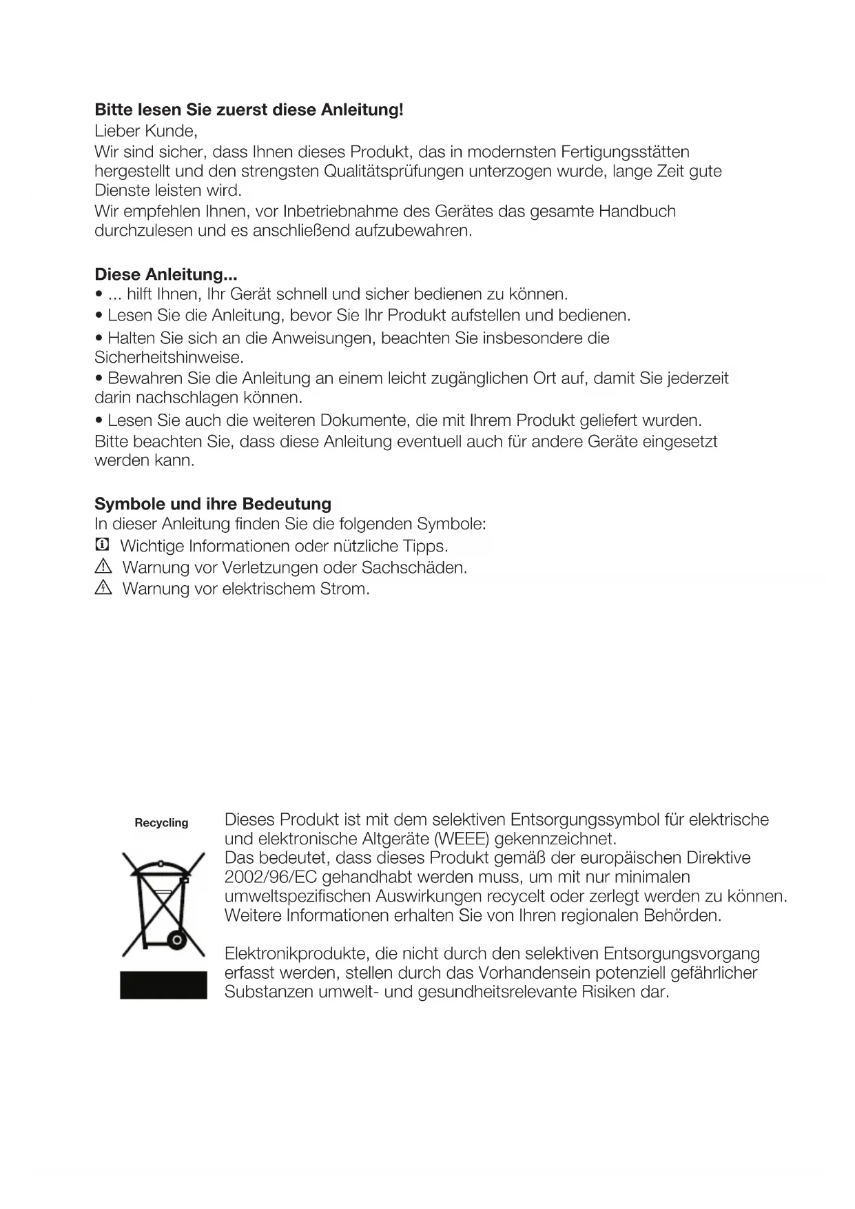 - Lesen Sie auch die weiteren Dokumente, die mit Ihrem Produkt geliefert wurden. Bitte beachten Sie, dass diese Anleitung eventuell auch für andere Geräte eingesetzt werden kann. Symbole und ihre Bedeutung In dieser Anleitung finden Sie die folgenden Symbole: C Wichtige Informationen oder nützliche Tipps. A Warnung vor Verletzungen oder Sachschäden. B Warnung vor elektrischem Strom. Dieses Produkt ist mit dem selektiven Entsorgungssymbol für elektrische und elektronische Altgeräte (WEEE) gekennzeichnet. Das bedeutet, dass dieses Produkt gemäß der europäischen Direktive 2002/96/EC gehandhabt werden muss, um mit nur minimalen umweltspezifischen Auswirkungen recycelt oder zerlegt werden zu können. Weitere Informationen erhalten Sie von Ihren regionalen Behörden. Elektronikprodukte, die nicht durch den selektiven Entsorgungsvorgang erfasst werden, stellen durch das Vorhandensein potenziell gefährlicher Substanzen umwelt- und gesundheitsrelevante Risiken dar. RecyclingDE