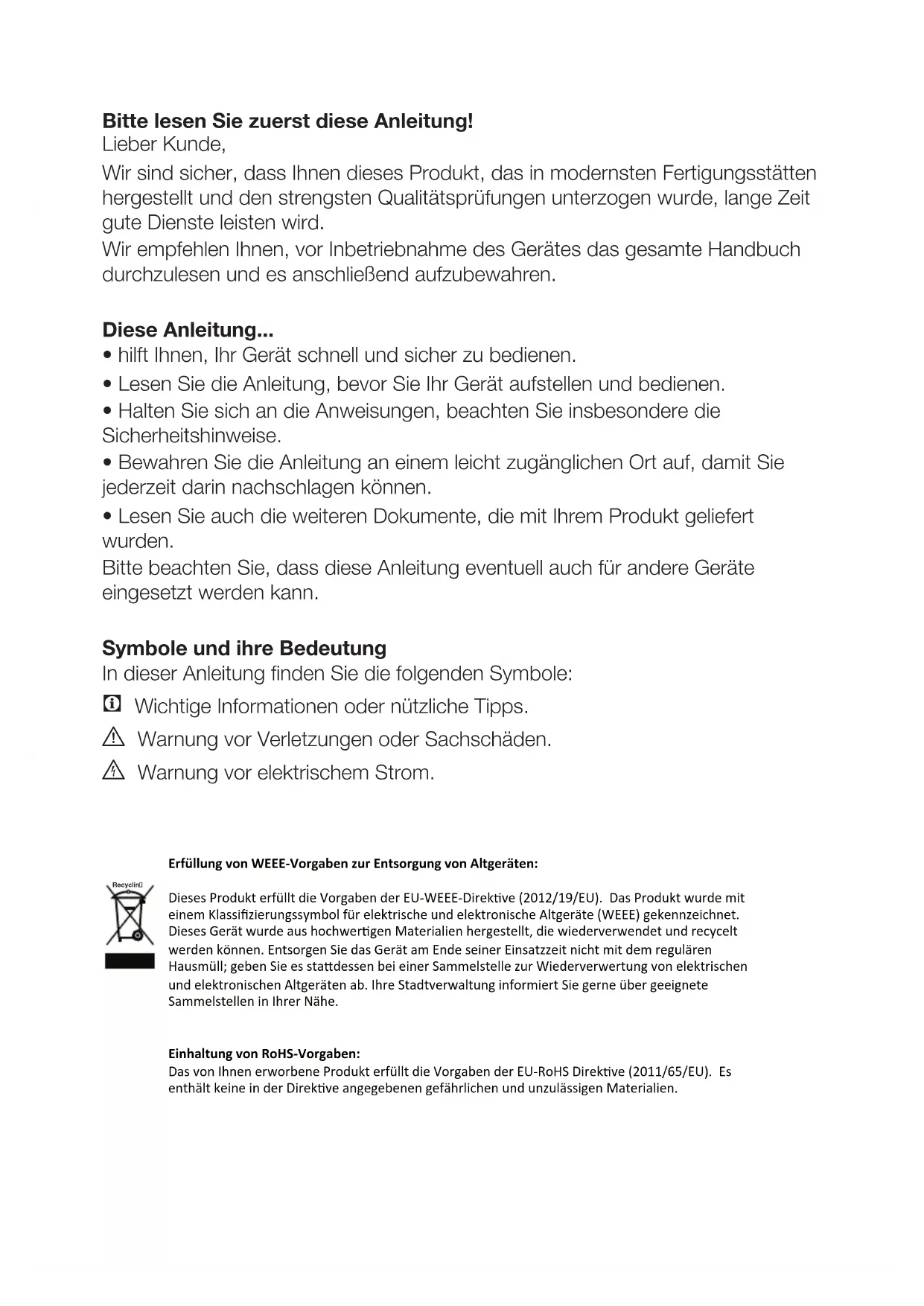 - Lesen Sie die Anleitung, bevor Sie Ihr Gerät aufstellen und bedienen.