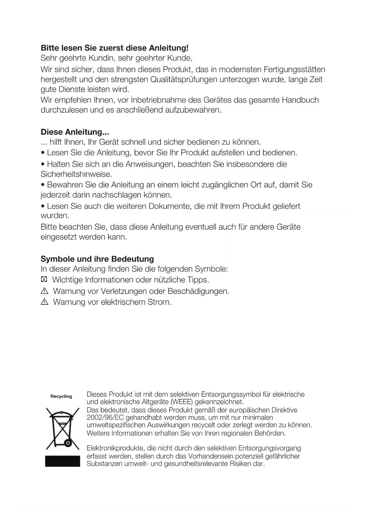 - Lesen Sie auch die weiteren Dokumente, die mit Ihrem Produkt geliefert wurden. Bitte beachten Sie, dass diese Anleitung eventuell auch für andere Geräte eingesetzt werden kann. Symbole und ihre Bedeutung In dieser Anleitung finden Sie die folgenden Symbole: C Wichtige Informationen oder nützliche Tipps. A Warnung vor Verletzungen oder Beschädigungen. B Warnung vor elektrischem Strom. Dieses Produkt ist mit dem selektiven Entsorgungssymbol für elektrische und elektronische Altgeräte (WEEE) gekennzeichnet. Das bedeutet, dass dieses Produkt gemäß der europäischen Direktive 2002/96/EC gehandhabt werden muss, um mit nur minimalen umweltspezifischen Auswirkungen recycelt oder zerlegt werden zu können. Weitere Informationen erhalten Sie von Ihren regionalen Behörden. Elektronikprodukte, die nicht durch den selektiven Entsorgungsvorgang erfasst werden, stellen durch das Vorhandensein potenziell gefährlicher Substanzen umwelt- und gesundheitsrelevante Risiken dar. RecyclingDE