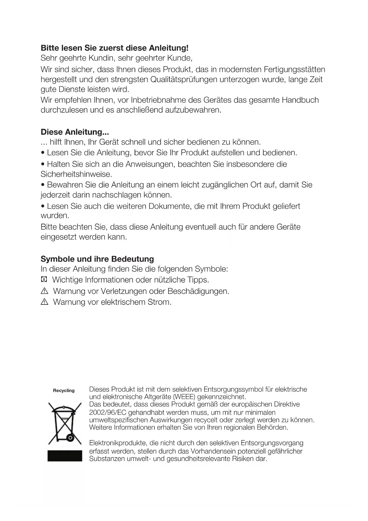 - Lesen Sie auch die weiteren Dokumente, die mit Ihrem Produkt geliefert wurden. Bitte beachten Sie, dass diese Anleitung eventuell auch für andere Geräte eingesetzt werden kann. Symbole und ihre Bedeutung In dieser Anleitung finden Sie die folgenden Symbole: C Wichtige Informationen oder nützliche Tipps. A Warnung vor Verletzungen oder Beschädigungen. B Warnung vor elektrischem Strom. Dieses Produkt ist mit dem selektiven Entsorgungssymbol für elektrische und elektronische Altgeräte (WEEE) gekennzeichnet. Das bedeutet, dass dieses Produkt gemäß der europäischen Direktive 2002/96/EC gehandhabt werden muss, um mit nur minimalen umweltspezifischen Auswirkungen recycelt oder zerlegt werden zu können. Weitere Informationen erhalten Sie von Ihren regionalen Behörden. Elektronikprodukte, die nicht durch den selektiven Entsorgungsvorgang erfasst werden, stellen durch das Vorhandensein potenziell gefährlicher Substanzen umwelt- und gesundheitsrelevante Risiken dar. RecyclingDE