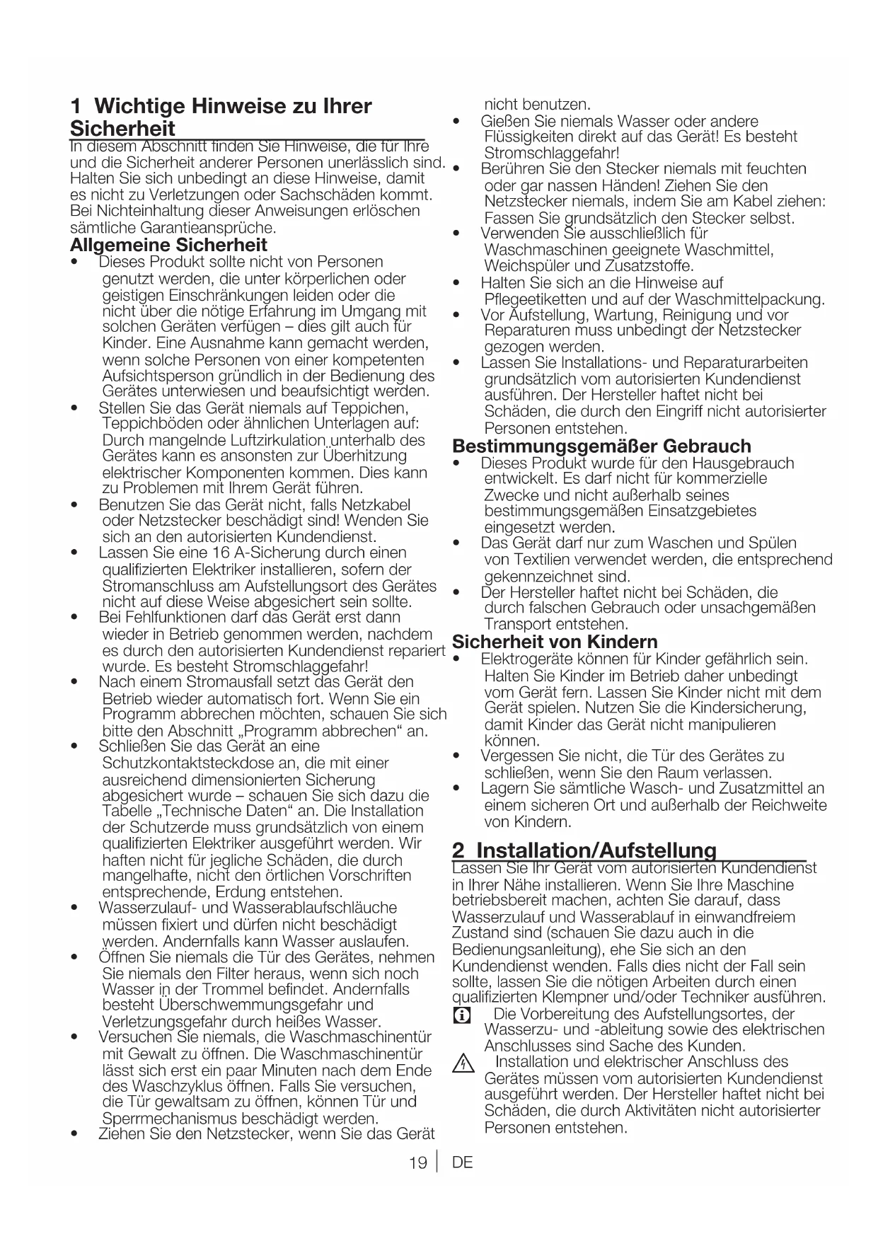 - DiesesProduktsolltenichtvonPersonengenutztwerden,dieunterkörperlichenodergeistigen Einschränkungen leiden oder die nichtüberdienötigeErfahrungimUmgangmitsolchenGerätenverfügen–diesgiltauchfürKinder. Eine Ausnahme kann gemacht werden, wenn solche Personen von einer kompetenten AufsichtspersongründlichinderBedienungdesGerätesunterwiesenundbeaufsichtigtwerden.• StellenSiedasGerätniemalsaufTeppichen,TeppichbödenoderähnlichenUnterlagenauf:DurchmangelndeLuftzirkulationunterhalbdesGeräteskannesansonstenzurÜberhitzungelektrischerKomponentenkommen.DieskannzuProblemenmitIhremGerätführen.• BenutzenSiedasGerätnicht,fallsNetzkabeloderNetzsteckerbeschädigtsind!WendenSiesich an den autorisierten Kundendienst.• LassenSieeine16A-SicherungdurcheinenqualifiziertenElektrikerinstallieren,sofernderStromanschluss am Aufstellungsort des Gerätes nichtaufdieseWeiseabgesichertseinsollte.• BeiFehlfunktionendarfdasGeräterstdannwiederinBetriebgenommenwerden,nachdemes durch den autorisierten Kundendienst repariert wurde.EsbestehtStromschlaggefahr!• NacheinemStromausfallsetztdasGerätdenBetriebwiederautomatischfort.WennSieeinProgrammabbrechenmöchten,schauenSiesichbittedenAbschnitt„Programmabbrechen“an.• SchließenSiedasGerätaneineSchutzkontaktsteckdose an, die mit einer ausreichend dimensionierten Sicherung abgesichertwurde–schauenSiesichdazudieTabelle„TechnischeDaten“an.DieInstallationder Schutzerde muss grundsätzlich von einem qualifiziertenElektrikerausgeführtwerden.WirhaftennichtfürjeglicheSchäden,diedurchmangelhafte,nichtdenörtlichenVorschriftenentsprechende, Erdung entstehen.• Wasserzulauf-undWasserablaufschläuchemüssenfixiertunddürfennichtbeschädigtwerden. Andernfalls kann Wasser auslaufen.• ÖffnenSieniemalsdieTürdesGerätes,nehmenSie niemals den Filter heraus, wenn sich noch WasserinderTrommelbefindet.AndernfallsbestehtÜberschwemmungsgefahrundVerletzungsgefahrdurchheißesWasser.• VersuchenSieniemals,dieWaschmaschinentürmitGewaltzuöffnen.DieWaschmaschinentürlässt sich erst ein paar Minuten nach dem Ende desWaschzyklusöffnen.FallsSieversuchen,dieTürgewaltsamzuöffnen,könnenTürundSperrmechanismusbeschädigtwerden.• ZiehenSiedenNetzstecker,wennSiedasGerätnichtbenutzen.• GießenSieniemalsWasseroderandereFlüssigkeitendirektaufdasGerät!EsbestehtStromschlaggefahr!• BerührenSiedenSteckerniemalsmitfeuchtenodergarnassenHänden!ZiehenSiedenNetzsteckerniemals,indemSieamKabelziehen:FassenSiegrundsätzlichdenSteckerselbst.• VerwendenSieausschließlichfürWaschmaschinen geeignete Waschmittel, WeichspülerundZusatzstoffe.• HaltenSiesichandieHinweiseaufPflegeetiketten und auf der Waschmittelpackung.• VorAufstellung,Wartung,ReinigungundvorReparaturenmussunbedingtderNetzsteckergezogen werden.• LassenSieInstallations-undReparaturarbeitengrundsätzlich vom autorisierten Kundendienst ausführen.DerHerstellerhaftetnichtbeiSchäden, die durch den Eingriff nicht autorisierter Personen entstehen. Bestimmungsgemäßer Gebrauch