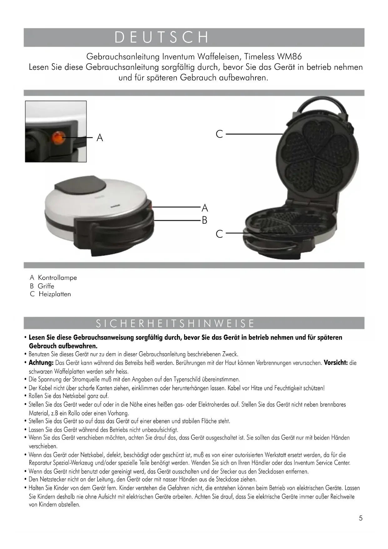 - Halten Sie Kinder von dem Gerät fern. Kinder verstehen die Gefahren nicht, die entstehen können beim Betrieb von elektrischen Geräte. Lassen Sie Kindern deshalb nie ohne Aufsicht mit elektrischen Geräte arbeiten. Achten Sie drauf, dass Sie elektrische Geräte immer außer Reichweite von Kindern abstellen. D E U T S C H A Kontrollampe B Griffe C Heizplatten Gebrauchsanleitung Inventum Waffeleisen, Timeless WM86 Lesen Sie diese Gebrauchsanleitung sorgfältig durch, bevor Sie das Gerät in betrieb nehmen und für späteren Gebrauch aufbewahren. S I C H E R H E I T S H I N W E I S E