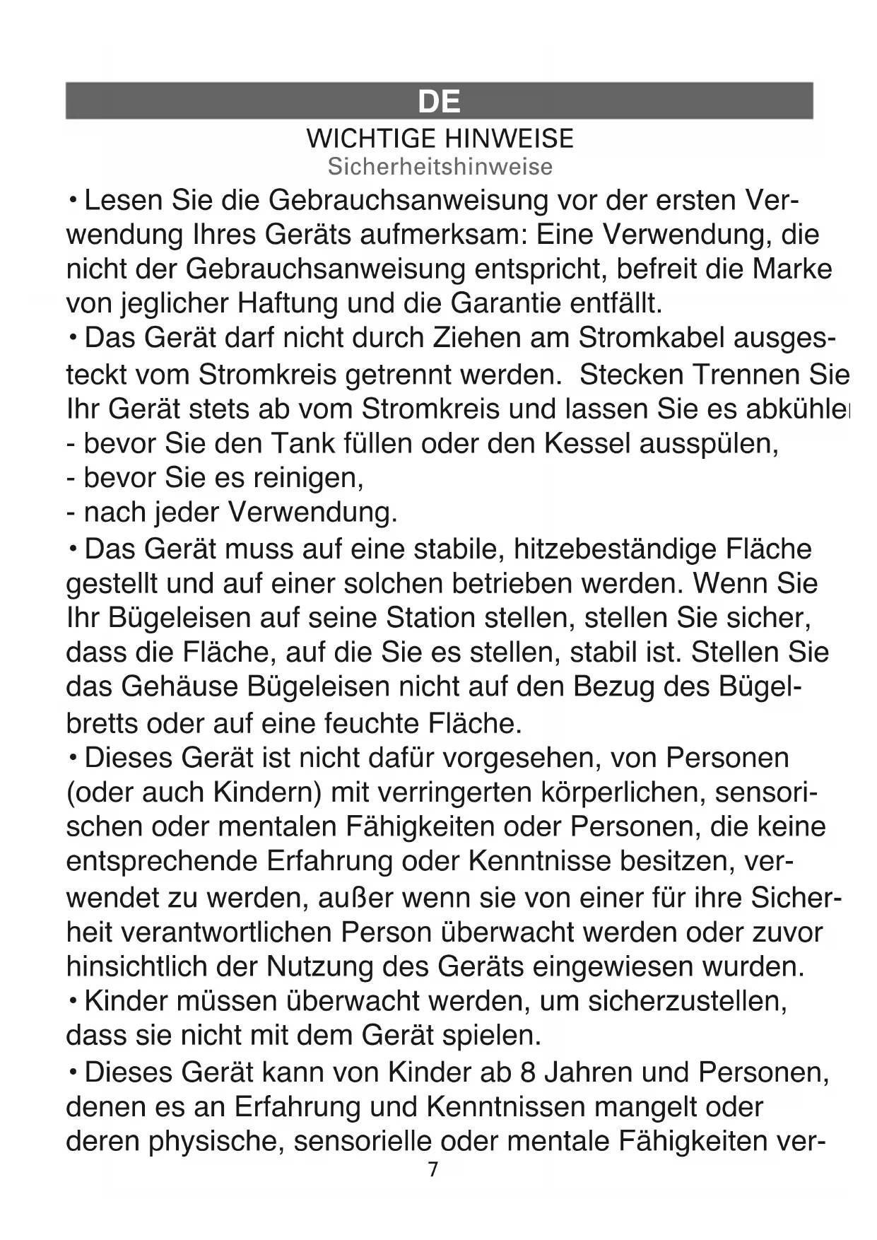 • Ihre Dampfstation ist ein elektrisches Gerät: Es muss unter normalen Gebrauchsbedingungen