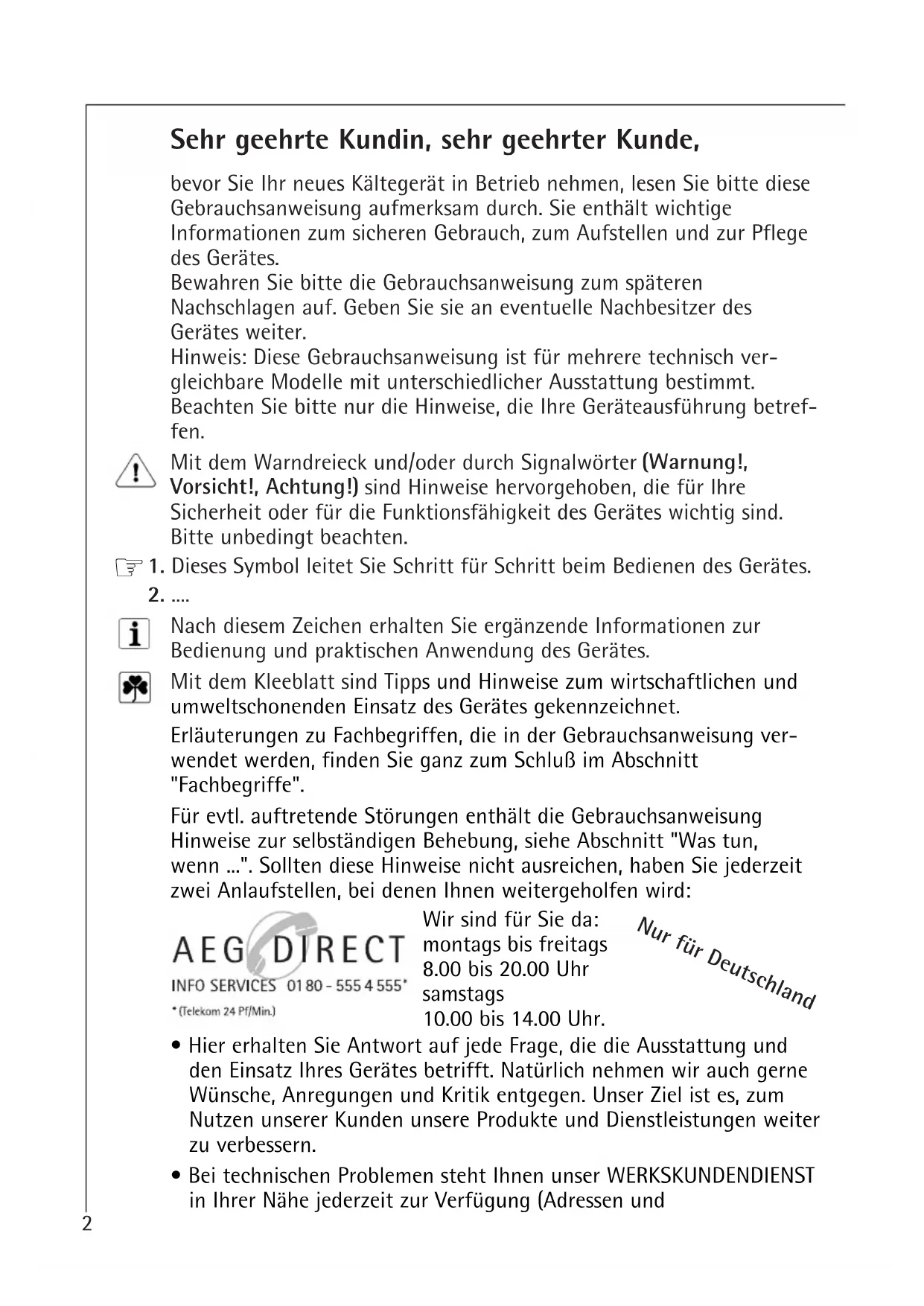 Nach diesem Zeichen erhalten Sie ergänzende Informationen zur Bedienung und praktischen Anwendung des Gerätes. Mit dem Kleeblatt sind Tipps und Hinweise zum wirtschaftlichen und umweltschonenden Einsatz des Gerätes gekennzeichnet. Erläuterungen zu Fachbegriffen, die in der Gebrauchsanweisung ver- wendet werden, finden Sie ganz zum Schluß im Abschnitt "Fachbegriffe". Für evtl. auftretende Störungen enthält die Gebrauchsanweisung Hinweise zur selbständigen Behebung, siehe Abschnitt "Was tun, wenn ...". Sollten diese Hinweise nicht ausreichen, haben Sie jederzeit zwei Anlaufstellen, bei denen Ihnen weitergeholfen wird: Wir sind für Sie da: montags bis freitags