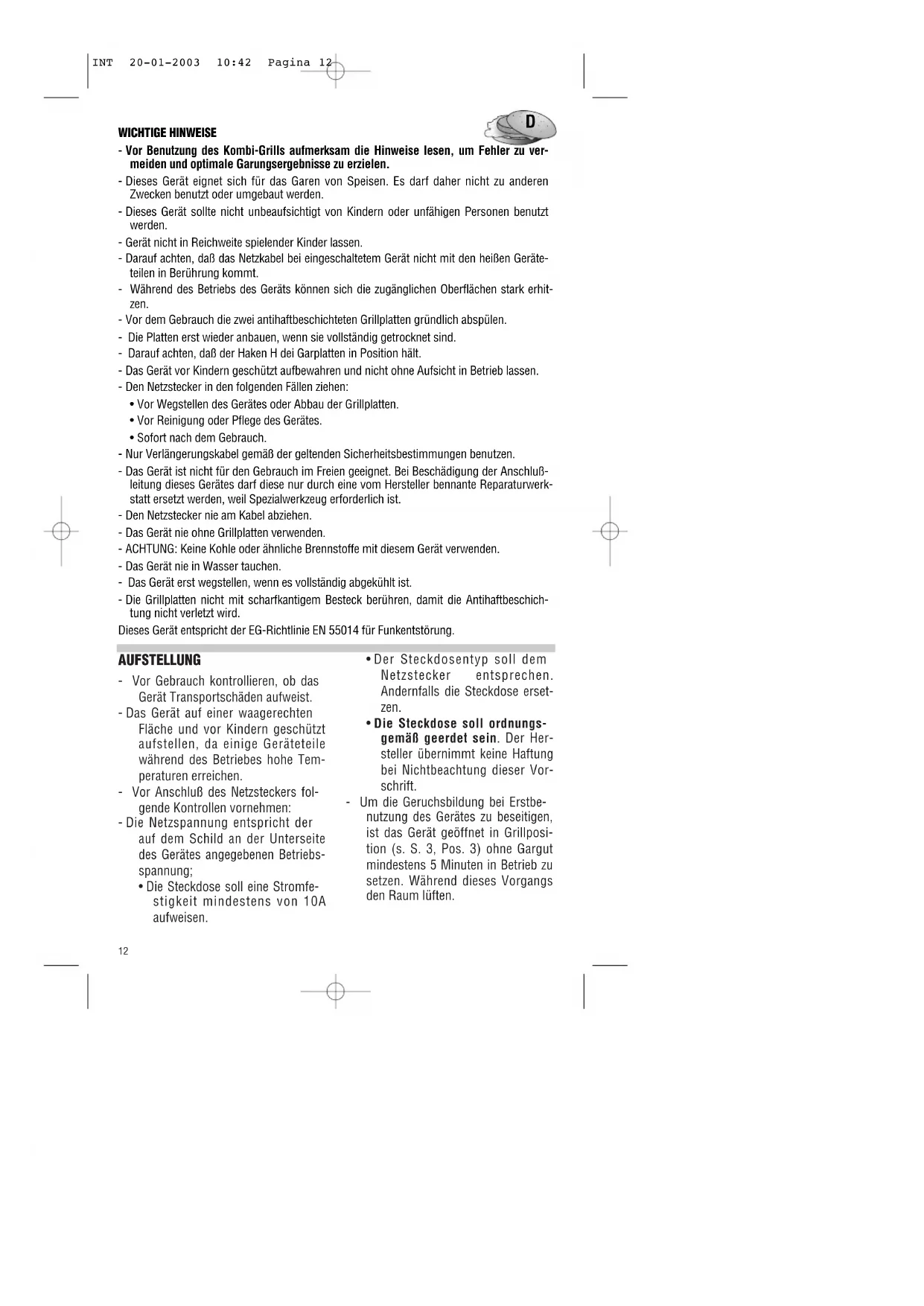 Um die Geruchsbildung bei Erstbentzung des Gerätes zu beseitigen, ist das Gerat geöffnet in Grillposition (s. S. 3, Pos. 3) ohne Gargut mindestens 5 Minuten in Betrieb zu setzen. Wahrend these Vorgangs den Raum luften.