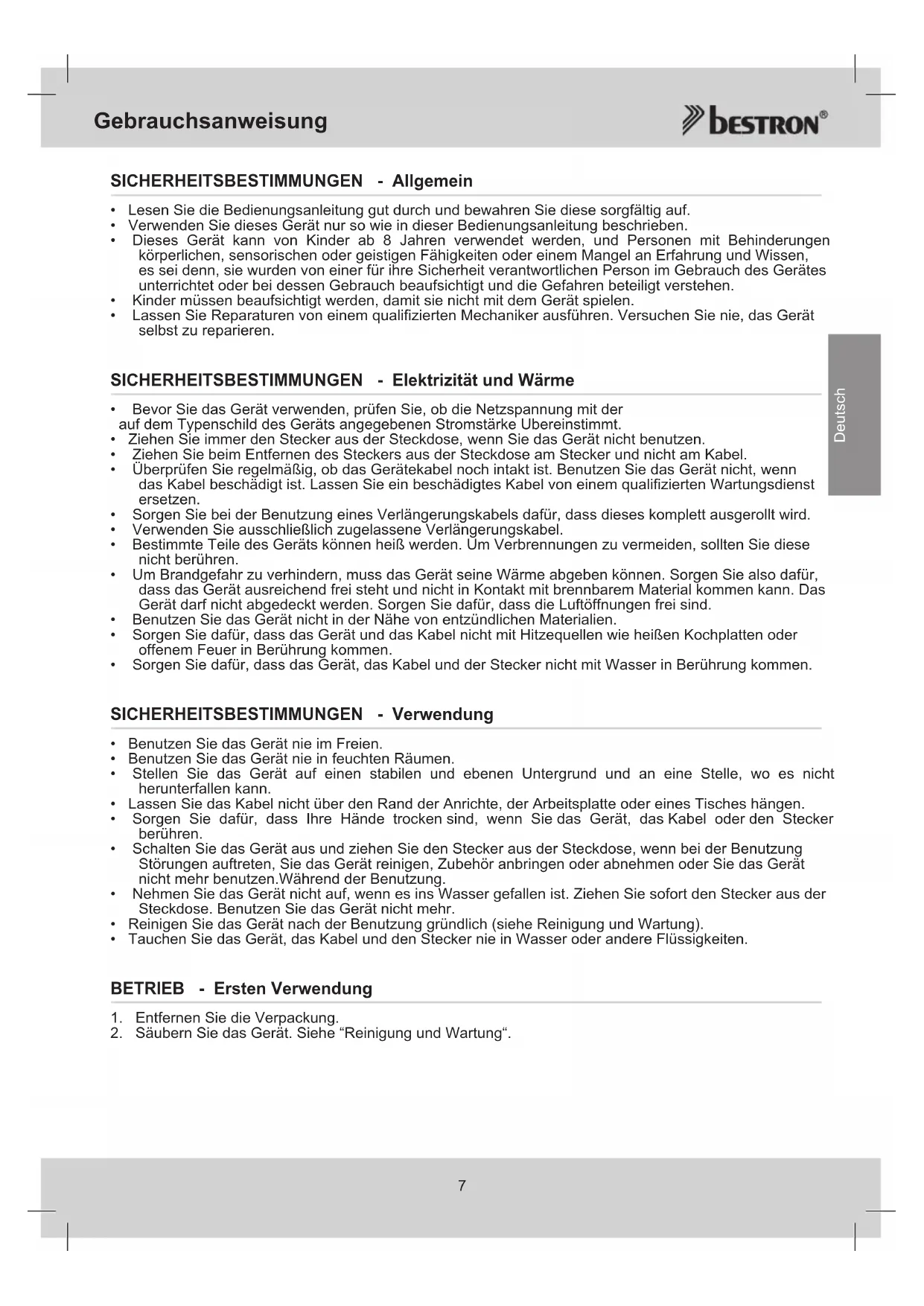 Deutsch KUNDENDIENST Sollte unerwartet eine Störung auftreten dann können Sie sich mit dem BESTRON-Kundendienst in Verbindung setzen: www.bestron.com/service