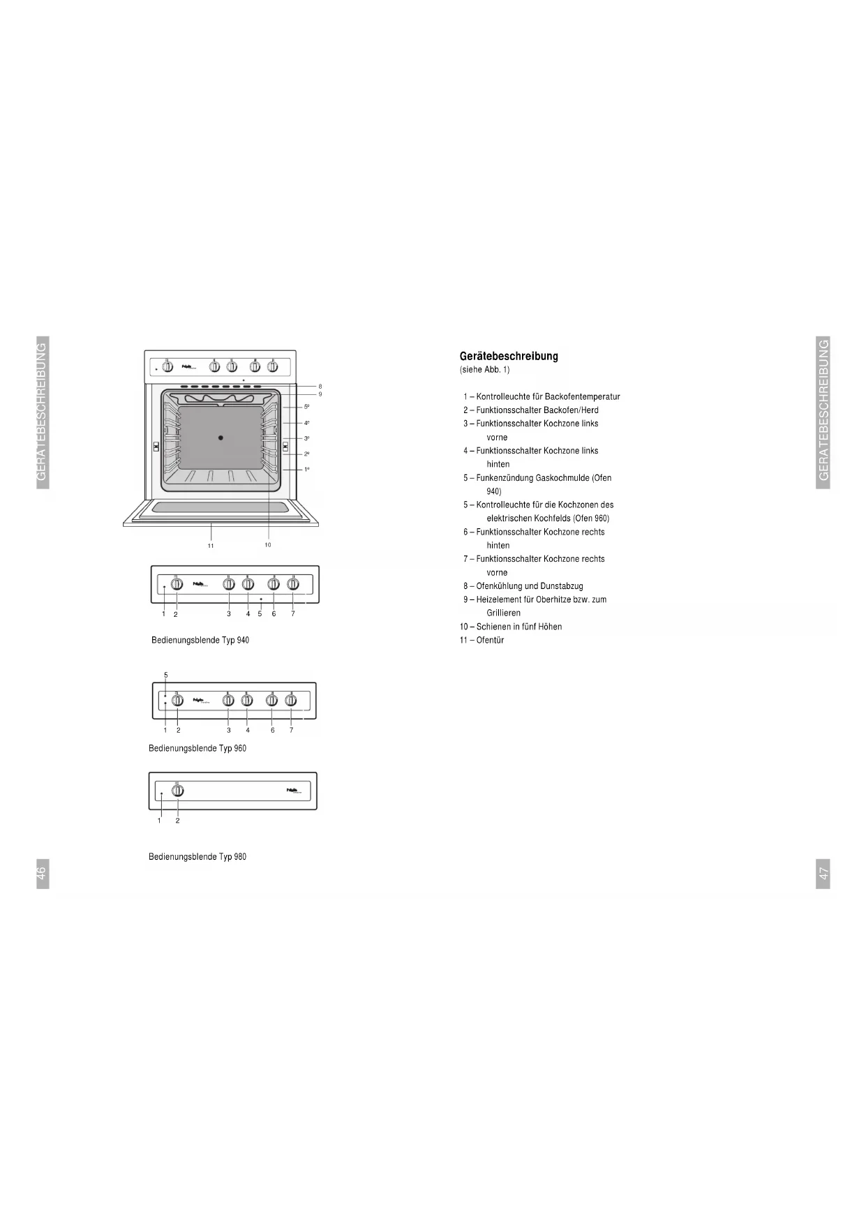 GERATEBESCHREIBUNG Gerätebeschreibung (siehe Abb. 1) 1 – Kontrolleuchte für Backofentemperatur 2 – Funktionsschalter Backofen/Herd 3 – Funktionsschalter Kochzone links vorne 4 – Funktionsschalter Kochzone links hinten 5 – Funkenzündung Gaskochmulde (Ofen 940) 5 – Kontrolleuchte für die Kochzonen des elektrischen Kochfelds (Ofen 960) 6 – Funktionsschalter Kochzone rechts hinten 7 – Funktionsschalter Kochzone rechts vorne 8 – Ofenkühlung und Dunstabzug 9 – Heizelement für Oberhitze bzw. zum Grillieren 10 – Schienen in fünf Höhen 11 – Ofentür