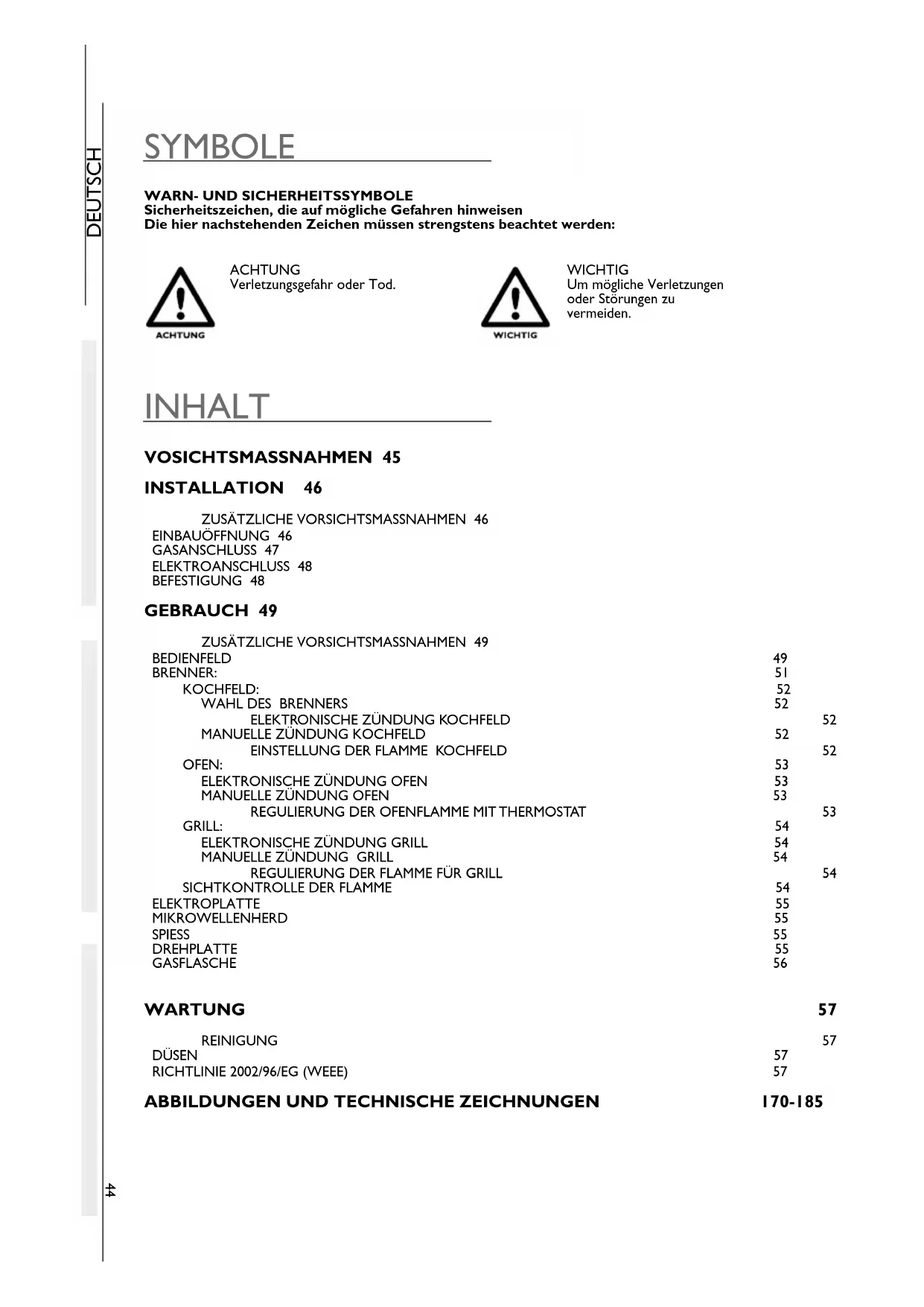 Sicherheitszeichen, die auf mögliche Gefahren hinweisen Die hier nachstehenden Zeichen müssen strengstens beachtet werden: INHALT VOSICHTSMASSNAHMEN 45 INSTALLATION 46