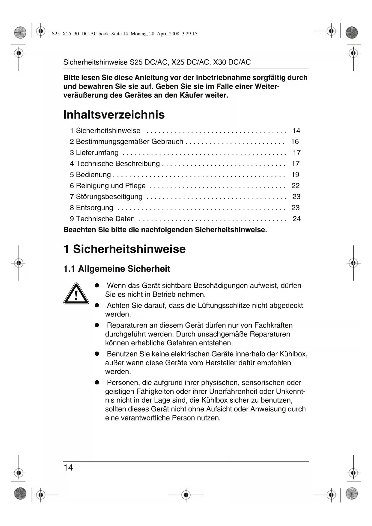 3Lieferumfang Bei Geräte-Ausführungen mit der Zusatzausstattung „Isolierdeckel“ zusätzlich: 4 Technische Beschreibung Die Kühlbox ist für den mobilen Einsatz geeignet. Sie kann Waren bis max. 16 °C (S25) bzw. 20 °C (X25/X30) unter Umgebungstemperatur abkühlen bzw. kühl halten. Die Kühlung ist eine verschleiß- und FCKW-freie Peltierkühlung mit Wärme- abfuhr durch einen Lüfter. S25 Zusätzliche Taschen außen dienen als weitere Staumöglichkeit. Beachten Sie, dass hierin aufbewahrte Gegenstände nicht gekühlt werden. Menge Bezeichnung 1 A, Seite 3 1 Kühlgerät 2 1, Seite 4 1 Anschlusskabel für 12-V-DC-Anschluss 2 2, Seite 4 1 Anschlusskabel für 220–240-V-AC-Anschluss Pos. in 1, Seite 3 Menge Bezeichnung B1Isolierdeckel _S25_X25_30_DC-AC.book Seite 17 Montag, 28. April 2008 3:29 15Technische Beschreibung S25 DC/AC, X25 DC/AC, X30 DC/AC