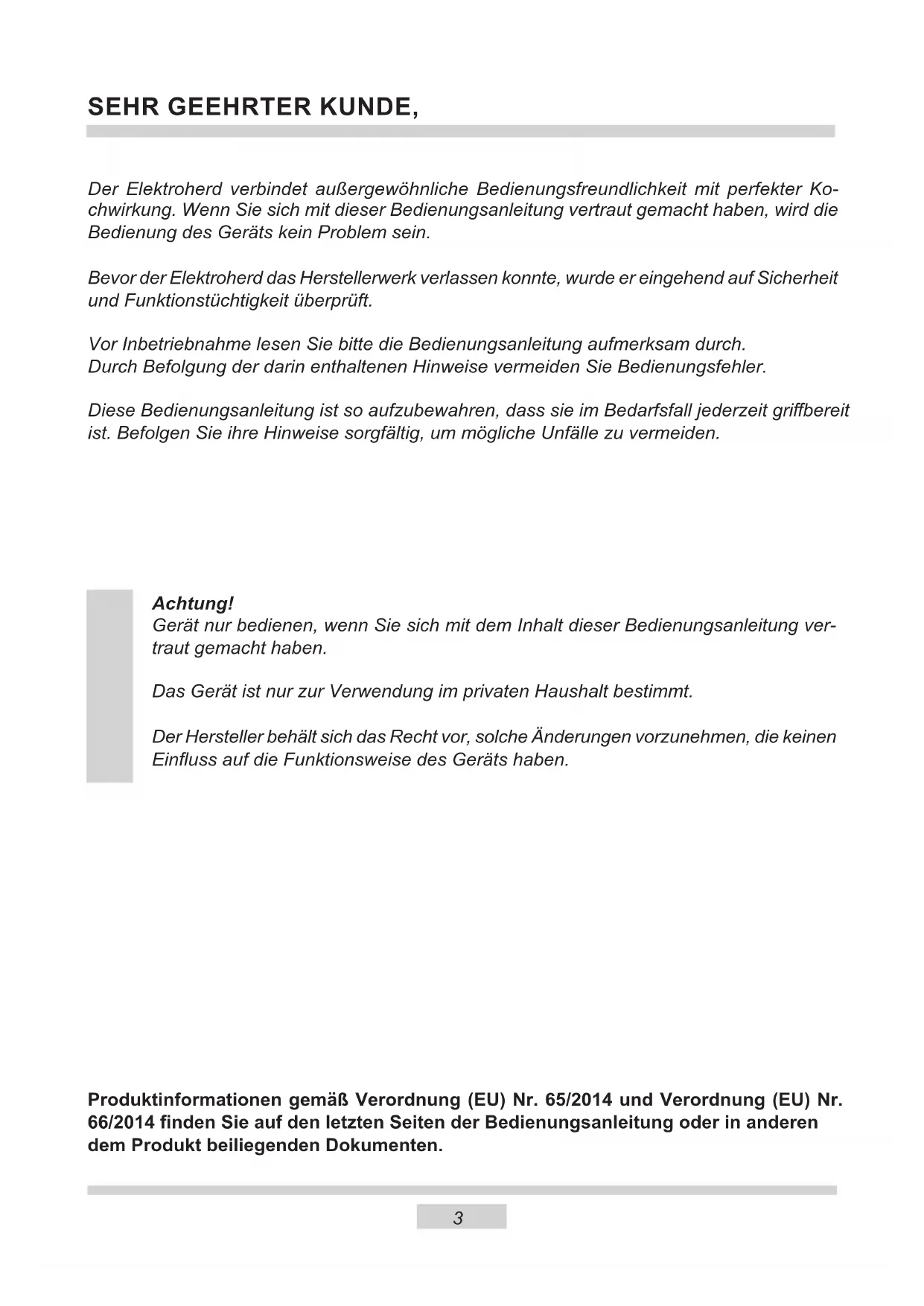 TECHNISCHE GEGEVENS 1443 SEHR GEEHRTER KUNDE, Der Elektroherd verbindet außergewöhnliche Bedienungsfreundlichkeit mit perfekter Ko- chwirkung. Wenn Sie sich mit dieser Bedienungsanleitung vertraut gemacht haben, wird die Bedienung des Geräts kein Problem sein. Bevor der Elektroherd das Herstellerwerk verlassen konnte, wurde er eingehend auf Sicherheit und Funktionstüchtigkeit überprüft. Vor Inbetriebnahme lesen Sie bitte die Bedienungsanleitung aufmerksam durch. Durch Befolgung der darin enthaltenen Hinweise vermeiden Sie Bedienungsfehler. Diese Bedienungsanleitung ist so aufzubewahren, dass sie im Bedarfsfall jederzeit gribereit ist. Befolgen Sie ihre Hinweise sorgfältig, um mögliche Unfälle zu vermeiden. Achtung! Gerät nur bedienen, wenn Sie sich mit dem Inhalt dieser Bedienungsanleitung ver- traut gemacht haben. Das Gerät ist nur zur Verwendung im privaten Haushalt bestimmt. Der Hersteller behält sich das Recht vor, solche Änderungen vorzunehmen, die keinen Einuss auf die Funktionsweise des Geräts haben. Produktinformationen gemäß Verordnung (EU) Nr. 65/2014 und Verordnung (EU) Nr. 66/2014 nden Sie auf den letzten Seiten der Bedienungsanleitung oder in anderen dem Produkt beiliegenden Dokumenten. DE4 SICHERHEITSHINWEISE Achtung. Das Gerät und seine zugänglichen Teile werden während der Benutzung heiß. Seien Sie beim Berühren sehr vorsichtig. Kinder unter 8 Jahren sollten sich nicht in der Nähe des Geräts aufhalten. Das Gerät darf von Kindern nur unter Aufsicht benutzt werden. Das Gerät darf von Kindern (ab einem Alter von 8 Jahren) sowie von Personen, die nicht im vollen Besitz ihrer körperli- chen, sensorischen oder geistigen Fähigkeiten sind nur unter Aufsicht und gebrauchsanweisungsgemäß benutzt werden. Kinder dürfen nicht mit dem Gerät spielen. Kinder dürfen Reinigungsarbeiten nur unter Aufsicht durchführen. Kinder dürfen das Gerät nur unter Aufsicht bedienen. Achtung! Erhitzen Sie Fett oder Öl niemals unbeaufsichtigt (Brandgefahr!). Versuchen Sie Flammen niemals mit Wasser zulöschen. Schalten Sie das Gerät aus und ersticken Sie die Flammen z.B. mit einem Topfdeckel oder einer nichtentammbaren Decke. Achtung! Verwenden Sie die Kochäche nicht als Ablage- äche (Brandgefahr!). Achtung! Sollten Sie auf der Kochäche Beschädigungen bemerken (Sprünge oder Brüche), schalten Sie das Gerät ab und trennen Sie es von der Stromversorgung (Strom- schlaggefahr!).5 SICHERHEITSHINWEISE Starke Erhitzung des Geräts während des Betriebs. Seien Sie vorsichtig und vermeiden Sie das Berühren der heißen Innenteile des Geräts. Zugängliche Teile können bei Be nut zung heiß werden. Kin- der fern halten. Achtung. Verwenden Sie zur Reinigung der Kochäche keine aggressiven Putzmittel oder scharfen Metallgegen- stände, die die Oberäche beschädigen könnten (Entstehung von Sprüngen oder Brüchen). Achtung.Um Stromschläge zu vermeiden, muss man sich vor dem Wechsel die Glühlampe vergewissern, dass das Gerät abgeschaltet ist. Zur Reinigung des Geräts keine Dampfreiniger verwen- den. Verbrühungsgefahr! Heißer Dampf kann beim Önen der Gerätetür entweichen. Während oder nach dem Garbetrieb die Gerätetür vorsichtig önen. Beim Önen nicht über die Gerätetür beugen. Beachten Sie, dass Dampf je nach Tem- peratur nicht sichtbar ist.6 SICHERHEITSHINWEISE Andere Haushaltsgeräte samt ihren Anschlusskabeln dürfen den Backofen nicht berühren oder auf den Kochächen auiegen, da deren Isolierung nicht hitzebe- ständig ist. Kochplatte von Verschmutzungen und übergelaufenem Kochgut freihalten. Dies betrit insbesondere Zucker, der mit dem Glaskeramik-Kochfeld reagiert und da- durch eine bleibende Beschädigung verursachen kann. Etwaige Verschmutzungen sind laufend zu beseitigen. Zur Vermeidung von irreversiblen Veränderungen des Kochfelds darf Geschirr mit feuchtem Boden nicht auf warme Kochächen gestellt werden. Nur Kochgeschirr verwenden, das nach Herstelleragaben für die Verwendung auf Glaskeramik-Kochfeldern geeignet ist. Bei Feststellung einer Beschädigung des Kochfelds – Kratzern, Rissen oder Ab- splitterungen – ist der Betrieb des Herdes sofort abzubrechen und die Reparatur bei der Kundendienststelle zu melden. Das Kochfeld nicht einschalten, ohne vorher ein Kochgeschirr darauf zu stellen. Scharfkantiges Geschirr, das eine Beschädigung des Kochfelds verursachen kann, darf nicht benutzt werden. Nicht auf die sich vorheizenden (nicht mit Geschirr überdeckten) Halogen-Koch- ächen schauen. Kochgeschirr mit einem Gewicht über 15 kg darf nicht auf die geönete Backofen- tür und Kochgeschirr mit einem Gewicht über 25 kg auf die Kochächen gestellt werden. Keine Scheuermittel oder scharfen Metallgegenstände zur Glasreinigung verwen- den; sie können die Oberäche zerkratzen, was dazu führen kann, dass das Glas springt. In nicht betriebsfähigem Zustand darf der Herd nicht benutzt werden. Sämtliche Mängel dürfen nur von einer autorisierten Fachkraft beseitigt werden. Das Gerät ist ausschließlich zum Kochen im haushaltsüblichen Rahmen ausgelegt. Ein anderweitiger Gebrauch jeder Art (z.B. zur Raumbeheizung) ist nicht bestim- mungsgemäß und kann gefährlich sein.7 Wer Energie verantwort- lich verbraucht, der schont nicht nur die Haushaltskas- se, sondern handelt auch umweltbewusst. Seien Sie dabei! Sparen Sie Elektro- energie! Folgendes können Sie tun: ● Das richtige Kochgeschirr benutzen. Töpfe mit achem und dickem Boden sparen bis zu 1/3 an Strom. Deckel nicht vergessen, sonst ist der Stromverbrauch 4-mal so hoch! ● Kochgeschirr auf die Kochäche ab- stimmen. Das Kochgeschirr sollte nie kleiner als die Kochäche sein. ● Kochächen und Topfböden stets sau- ber halten. Verschmutzungen stören die Wärmeübertra- gung – sind sie erst einmal stark eingebrannt, ist die Reinigung oft nur noch mit umweltbe- lastenden Mitteln möglich. ● Unnötiges „Topfgucken” vermeiden. Auch die Backofentür nicht unnötig oft önen. Recht