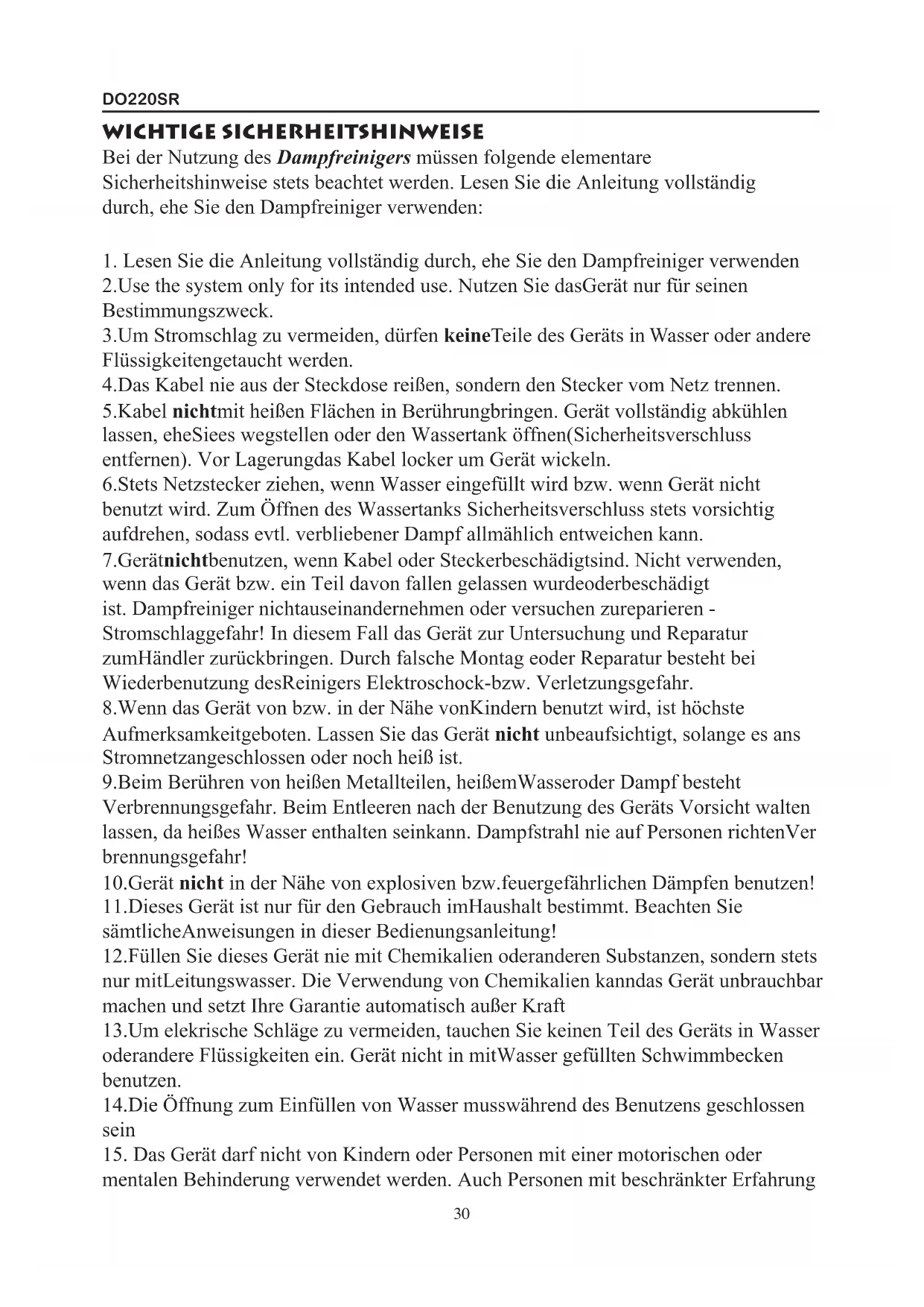(Stromkreis) des Dampfreinigers anschlie§en. 2.Sollte eine Verlängerungsschnur unbedingt erforderlich sein, muss ein Kabel mit einer Bemessungsstromstärke von mindestens 10 Ampere und einem 14er Querschnitt benutzt werden, da ansonsten †berhitzung droht. Es ist darauf zu achten, dass die Schnur nicht herausgerissen oder darüber gestolpert werden kann. 3.GerŠt nichtunbeaufsichtigt lassen, wenn es an das Stromnetz angeschlossen ist. ACHTUNG: Dieses Gerät ist zur Sicherheit mit einem geerdeten CEE7/7- Stromkabelstecker (Schuko) ausgestattet, der nicht manipuliert werden darf. ACHTUNG: Lassen Sie vor der Verwendung bzw. nach längerer Nichtbenutzung des Geräts im Schlauch bendliches Kondenswasser ablaufen. Halten Sie dazu die Schlauchdüse in einen entsprechenden Behälter oder ein Becken und drücken Sie den Dampfauslöseknopf auf dem Handgriff. Nachdem das Wasser abgelaufen ist, kann das Gerät normal benutzt werden. Richten Sie die Düse nie auf Personen, Tiere oder Panzen. ACHTUNG: Der Dampfreiniger ist zum Reinigen harter Flächen und Polster konzipiert worden, die großer Hitze standhalten können. Benutzen Sie ihn nicht zum Reinigen von weichem Kunststoff und Kaltglas. Auf Flächen, die mit Wachs behandelt wurden und auf einigen nicht gewachsten Böden kann der Glanz durch die Hitze-und Dampfeinwirkung u.U. verloren gehen. Nicht auf unversiegeltem Holz verwenden –die Holzmaserung kann sich dabei u.U. heben. Es wird daher empfohlen, zuvor zunächst einen Test auf einer einzelnen Stelle der zu reinigenden Fläche durchzuführen. WICHTIG:KEINEReinigungslösungen, parfümierte Substanzen, Öl oder andere Chemikalien zum Wasser hinzugeben. Nutzen Sie Leitungswasser oder –bei sehr hartem Wasser –destilliertes/aufbereitetes Wasser. ACHTUNG! Verbrühungsgefahr! Gehen Sie vorsichtig mit dem Dampfreiniger um. Der hier frei werdende Dampf ist sehr heiß.. 32DO220SR LERNEN SIE HIER ALLES ÜBER IHERN DAMPFREIRUGER 1.Hauptgeräteteil 2.Sicherheitsverschluss 3.Grüne Dampeuchte 4.Griff 5.Ein/Ausschalter 6.Kunsstoffschlauch 7.Handgriff 8.Dampfauslöser 9.Verlängerungsrohre (2) 10.Konzentratordüse 11.Bürsten (Kunststoffborsten) (2) 12.Fensterwischer 13aAdapterstück für Bodenwischer 13b.Bodenwischerrahmen 14.Bodenwischtuch