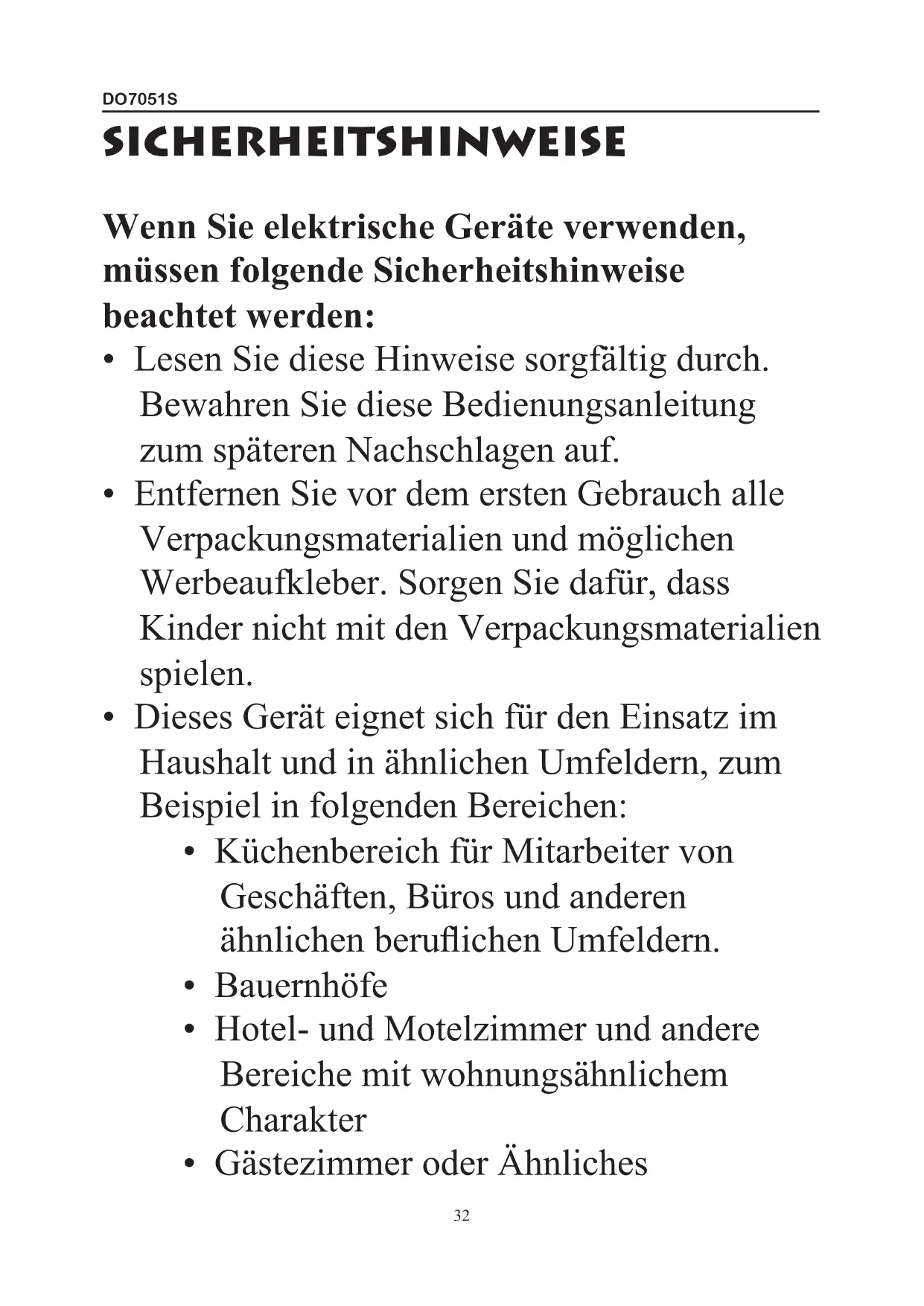 - Diese Gerät darf von Kindern ab 16 Jahren und Menschen mit körperlichen oder sensorischen Behinderungen oder Menschen mit eingeschränkten geistigen Fähigkeiten oder mangelnder Erfahrung bzw. Sachkenntnis unter der Bedingung verwendet werden, dass diese Personen beaufsichtigt werden oder sie eine Anleitung zur sicheren Verwendung des Geräts erhalten haben und sich der Gefahren bei der Verwendung des Geräts bewusst sind. Kinder dürfen nicht mit dem Gerät spielen. Die Wartung undDO7051S