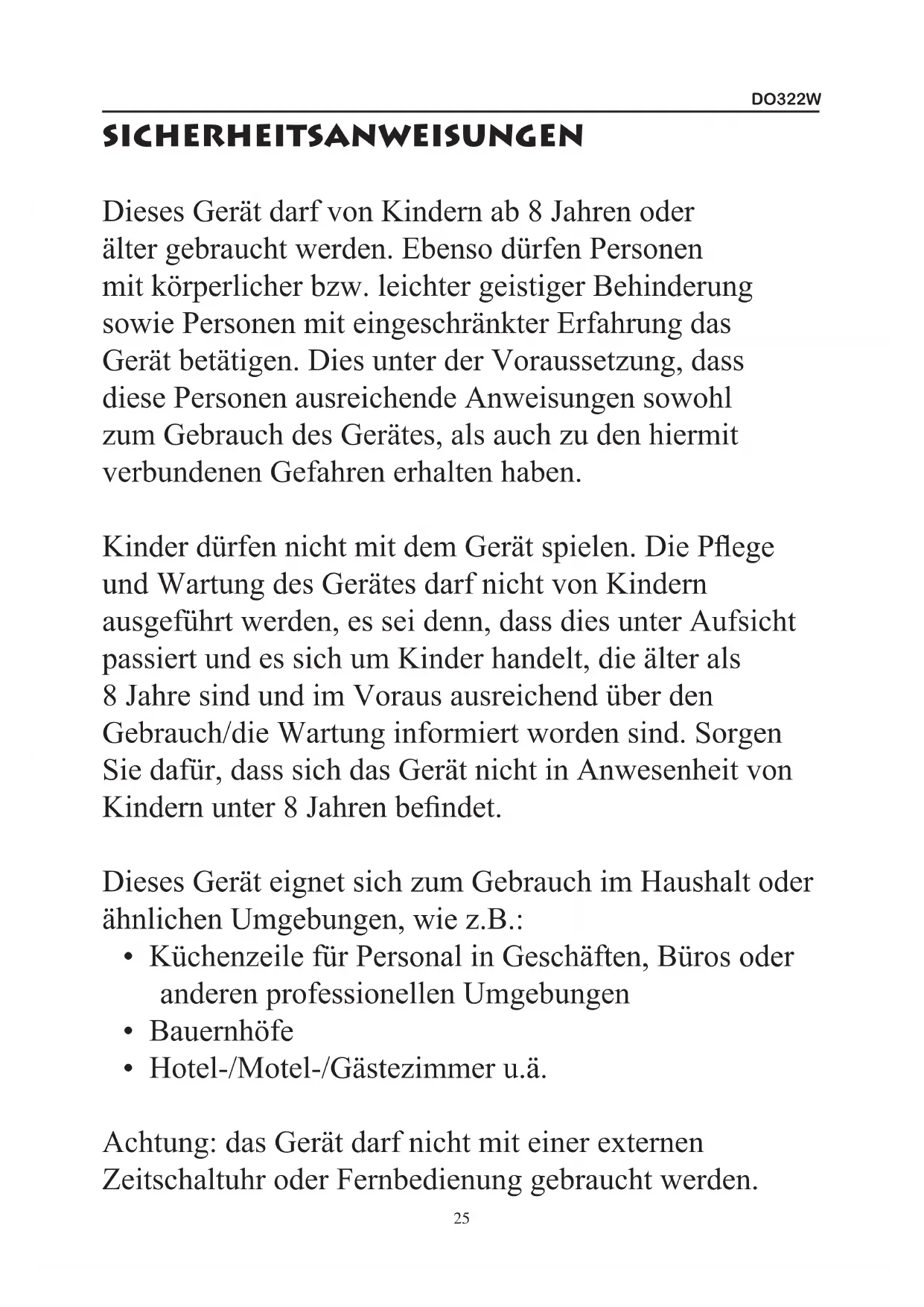 - Hotel-/Motel-/Gästezimmer u.ä. Achtung: das Gerät darf nicht mit einer externen Zeitschaltuhr oder Fernbedienung gebraucht werden.DO322W
