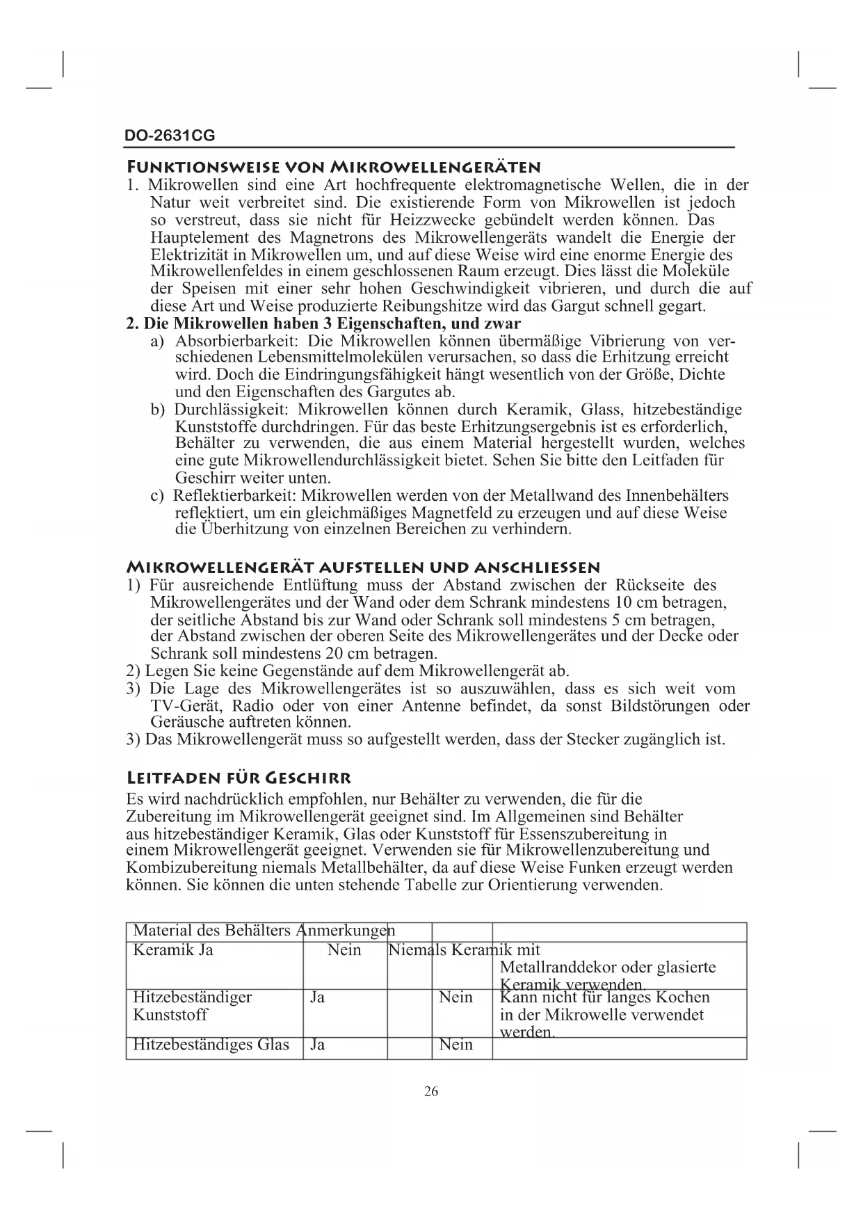 a) Absorbierbarkeit: Die Mikrowellen können übermäßige Vibrierung von ver- schiedenen Lebensmittelmolekülen verursachen, so dass die Erhitzung erreicht wird. Doch die Eindringungsfähigkeit hängt wesentlich von der Größe, Dichte und den Eigenschaften des Gargutes ab. b) Durchlässigkeit: Mikrowellen können durch Keramik, Glass, hitzebeständige Kunststoffe durchdringen. Für das beste Erhitzungsergebnis ist es erforderlich, Behälter zu verwenden, die aus einem Material hergestellt wurden, welches eine gute Mikrowellendurchlässigkeit bietet. Sehen Sie bitte den Leitfaden für Geschirr weiter unten. c) Reflektierbarkeit: Mikrowellen werden von der Metallwand des Innenbehälters reflektiert, um ein gleichmäßiges Magnetfeld zu erzeugen und auf diese Weise die Überhitzung von einzelnen Bereichen zu verhindern. Mikrowellengerät aufstellen und anschließen