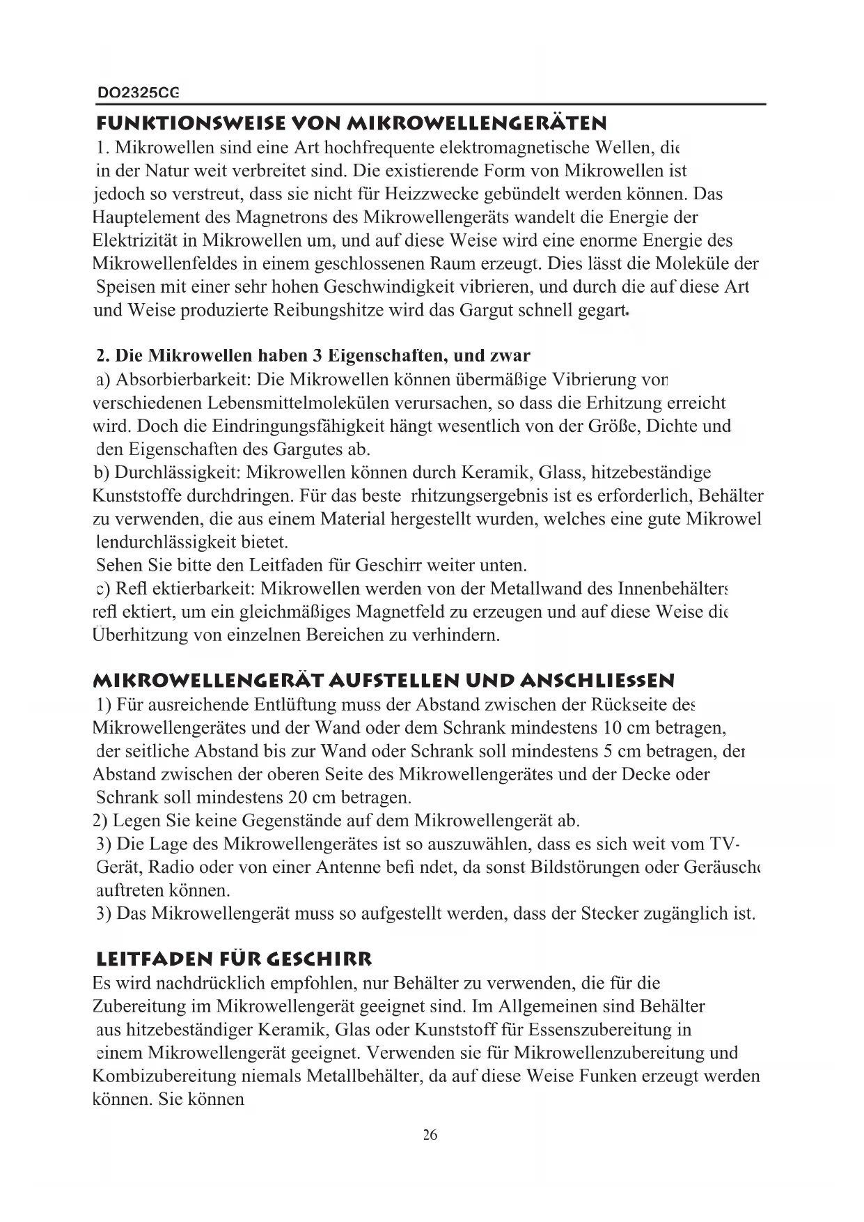 2DO2325CG WICHTIGE SICHERHEITSHINWEISE Folgende Vorsichtsmaßnahmen sollten bei der Nutzung von Elektrogeräten immer befolgt werden: