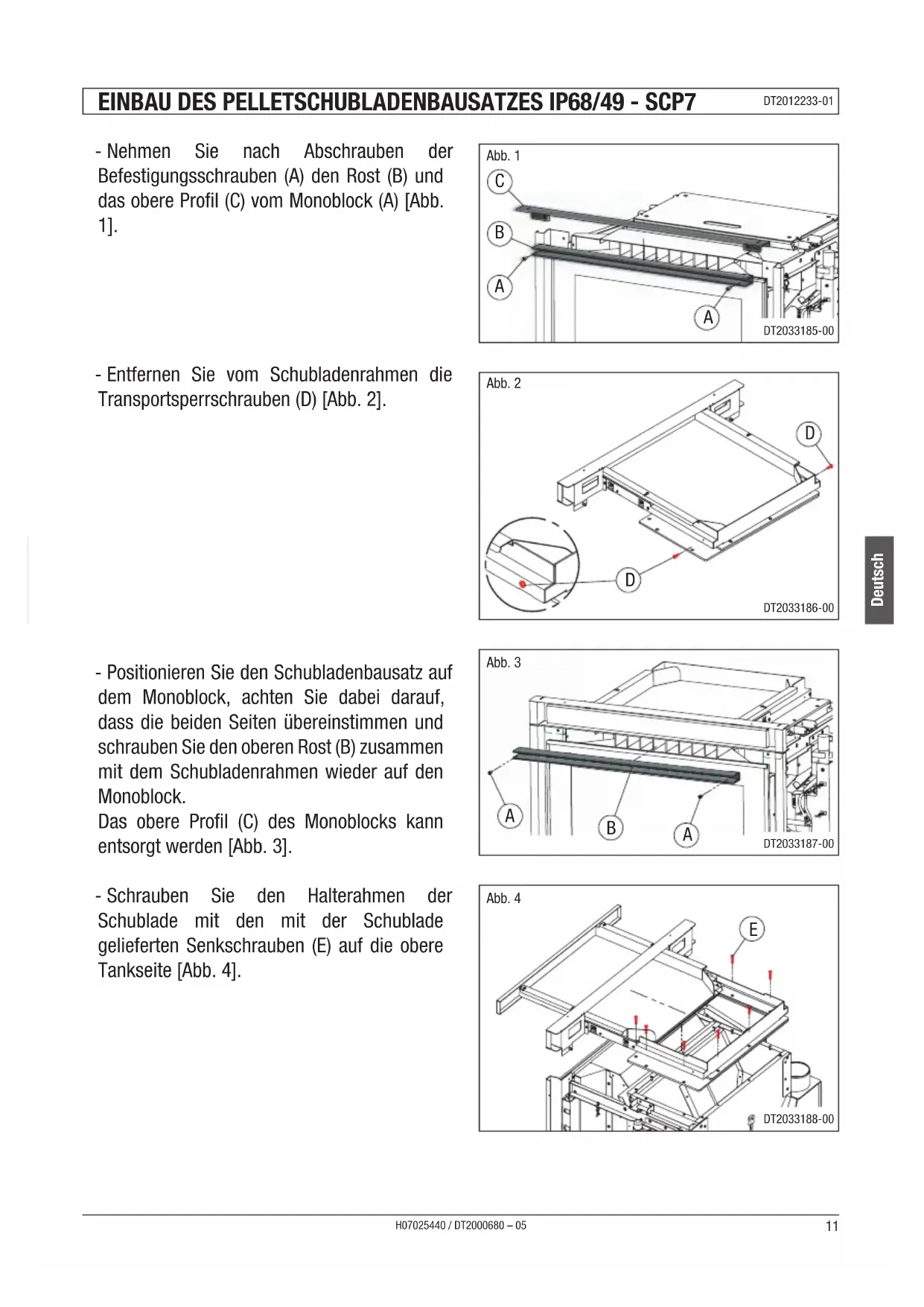 EINBAU DES PELLETSCHUBLADENBAUSATZES IP78/58 - IP78/68 - SCP9 DT2012460-00