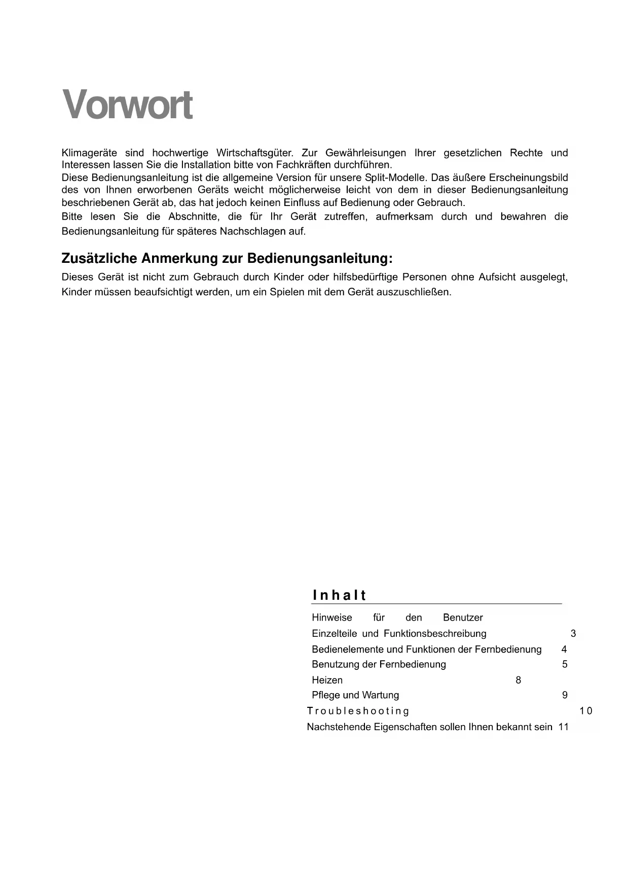 Diese Bedienungsanleitung ist die allgemeine Version für unsere Split-Modelle. Das äußere Erscheinungsbild