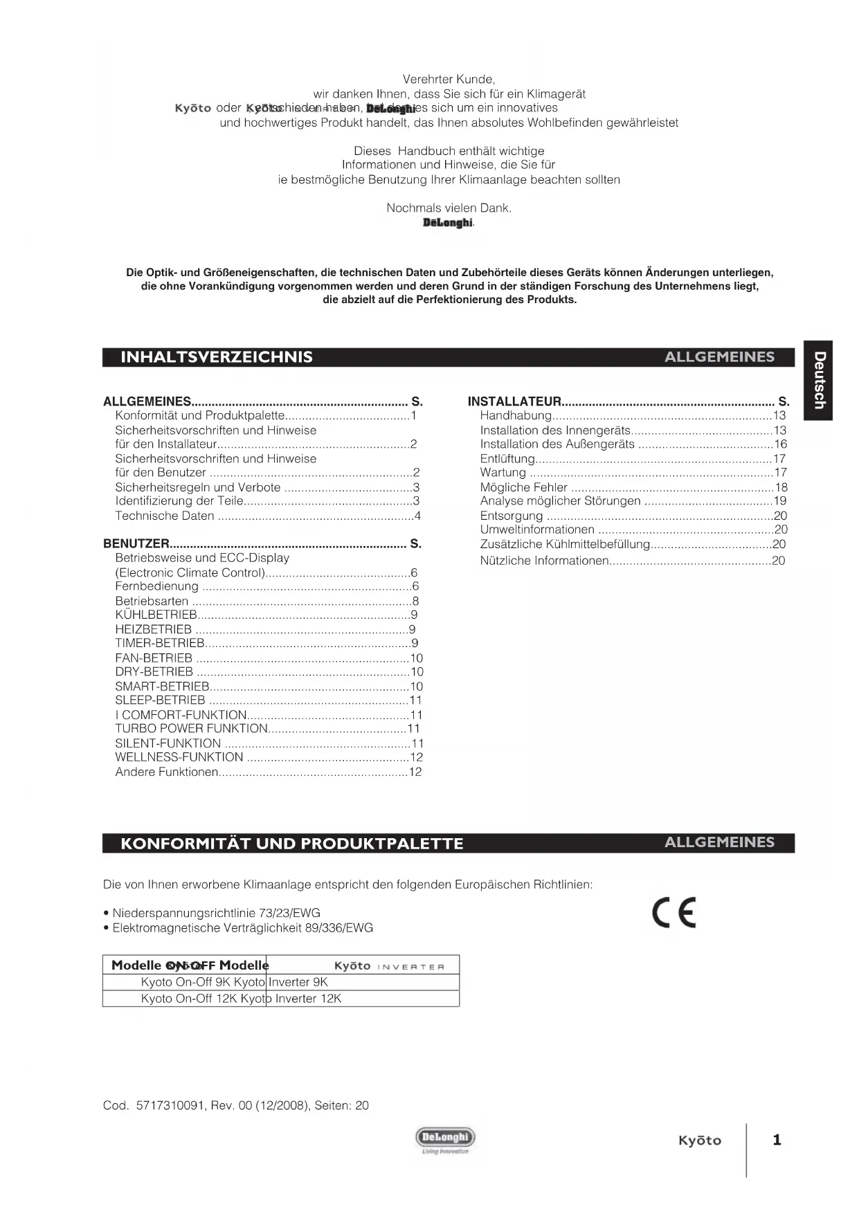 Die Optik- und Größeneigenschaften, die technischen Daten und Zubehörteile dieses Geräts können Änderungen unterliegen, die ohne Vorankündigung vorgenommen werden und deren Grund in der ständigen Forschung des Unternehmens liegt, die abzielt auf die Perfektionierung des Produkts. Modelle ON-OFF Modelle Kyoto On-Off 9K Kyoto Inverter 9K Kyoto On-Off 12K Kyoto Inverter 12K INHALTSVERZEICHNIS ALLGEMEINES