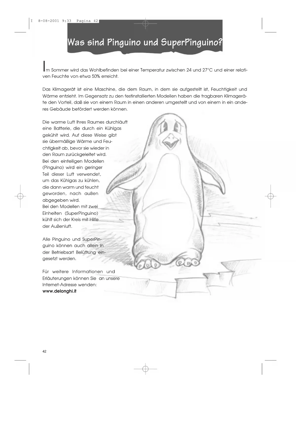 - Conditions standards: Température interne: 27°C 47% Humidité relative Température externe: 35°C 41% Humidité relative Cet appareil contient des substances qui, dégagées dans l'atmosphère, nuise à la couche d'o- zone; il est, par conséquent, conseillé de ne pas perforer le circuit frigorifique de l'appareil. Lor- sque vous décidez de ne plus vous en servir, portez le climatiseur à une société de traitement des déchets autorisée. I 8-08-2001 9:32 Pagina 4142 Im Sommer wird das Wohlbefinden bei einer Temperatur zwischen 24 und 27°C und einer relati- ven Feuchte von etwa 50% erreicht. Das Klimagerät ist eine Maschine, die dem Raum, in dem sie aufgestellt ist, Feuchtigkeit und Wärme entzieht. Im Gegensatz zu den festinstallierten Modellen haben die tragbaren Klimagerä- te den Vorteil, daß sie von einem Raum in einen anderen umgestellt und von einem in ein ande- res Gebäude befördert werden können. Die warme Luft Ihres Raumes durchläuft eine Batterie, die durch ein Kühlgas gekühlt wird. Auf diese Weise gibt sie übermäßige Wärme und Feu- chtigkeit ab, bevor sie wieder in den Raum zurückgeleitet wird. Bei den einteiligen Modellen (Pinguino) wird ein geringer Teil dieser Luft verwendet, um das Kühlgas zu kühlen, die dann warm und feucht geworden, nach außen abgegeben wird. Bei den Modellen mit zwei Einheiten (SuperPinguino) kühlt sich der Kreis mit Hilfe der Außenluft. Alle Pinguino und SuperPin- guino können auch allein in der Betriebsart Belüftung ein- gesetzt werden. Für weitere Informationen und Erläuterungen können Sie an unsere Internet-Adresse wenden: www.delonghi.it Was sind Pinguino und SuperPinguino? I 8-08-2001 9:33 Pagina 4243 DEUTSCH