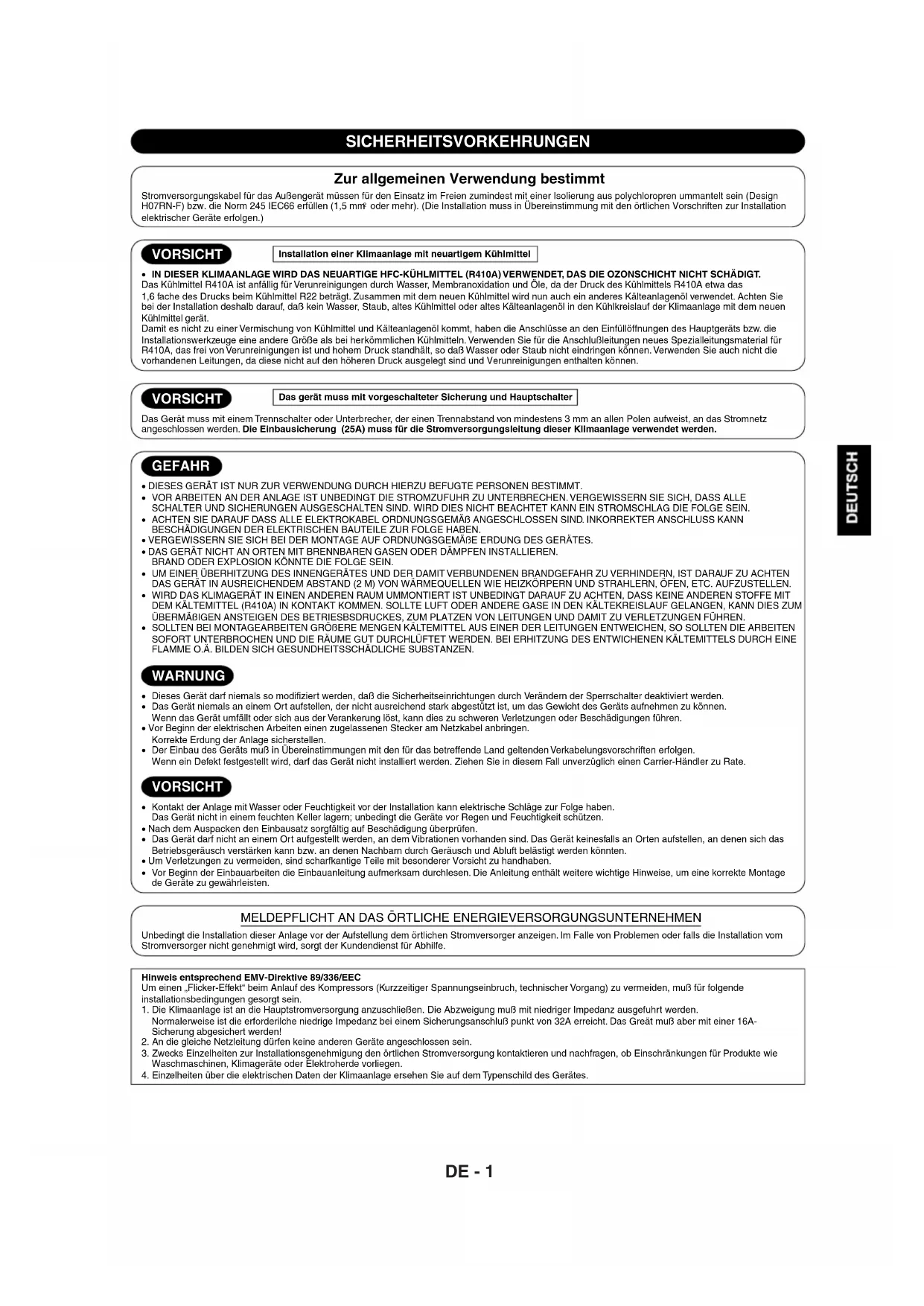 Unbedingt die Installation dieser Anlage vor der Aufstellung dem örtlichen Stromversorger anzeigen. Im Falle von Problemen oder falls die Installation vom Stromversorger nicht genehmigt wird, sorgt der Kundendienst für Abhilfe.Hinweis entsprechend EMV-Direktive 89/336/EEC Um einen „Flicker-Effekt“ beim Anlauf des Kompressors (Kurzzeitiger Spannungseinbruch, technischer Vorgang) zu vermeiden, muß für folgende installationsbedingungen gesorgt sein. 1. Die Klimaanlage ist an die Hauptstromversorgung anzuschließen. Die Abzweigung muß mit niedriger Impedanz ausgefuhrt werden. Normalerweise ist die erforderilche niedrige Impedanz bei einem Sicherungsanschluß punkt von 32A erreicht. Das Greät muß aber mit einer 16A- Sicherung abgesichert werden!2. An die gleiche Netzleitung dürfen keine anderen Geräte angeschlossen sein. 3. Zwecks Einzelheiten zur Installationsgenehmigung den örtlichen Stromversorgung kontaktieren und nachfragen, ob Einschränkungen für Produkte wie Waschmaschinen, Klimageräte oder Elektroherde vorliegen.