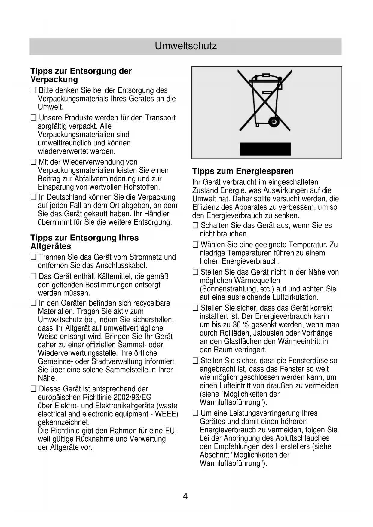 Umweltschutz Tipps zur Entsorgung der Verpackung ❏ Bitte denken Sie bei der Entsorgung des Verpackungsmaterials Ihres Gerätes an die Umwelt. ❏ Unsere Produkte werden für den Transport sorgfältig verpackt. Alle Verpackungsmaterialien sind umweltfreundlich und können wiederverwertet werden. ❏ Mit der Wiederverwendung von Verpackungsmaterialien leisten Sie einen Beitrag zur Abfallverminderung und zur Einsparung von wertvollen Rohstoffen. ❏ In Deutschland können Sie die Verpackung auf jeden Fall an dem Ort abgeben, an dem Sie das Gerät gekauft haben. Ihr Händler übernimmt für Sie die weitere Entsorgung. Tipps zur Entsorgung Ihres Altgerätes ❏ Trennen Sie das Gerät vom Stromnetz und entfernen Sie das Anschlusskabel. ❏ Das Gerät enthält Kältemittel, die gemäß den geltenden Bestimmungen entsorgt werden müssen. ❏ In den Geräten befinden sich recycelbare Materialien. Tragen Sie aktiv zum Umweltschutz bei, indem Sie sicherstellen, dass Ihr Altgerät auf umweltverträgliche Weise entsorgt wird. Bringen Sie Ihr Gerät daher zu einer offiziellen Sammel- oder Wiederverwertungsstelle. Ihre örtliche Gemeinde- oder Stadtverwaltung informiert Sie über eine solche Sammelstelle in Ihrer Nähe. ❏ Dieses Gerät ist entsprechend der europäischen Richtlinie 2002/96/EG über Elektro- und Elektronikaltgeräte (waste electrical and electronic equipment - WEEE) gekennzeichnet. Die Richtlinie gibt den Rahmen für eine EU- weit gültige Rücknahme und Verwertung der Altgeräte vor. Tipps zum Energiesparen Ihr Gerät verbraucht im eingeschalteten Zustand Energie, was Auswirkungen auf die Umwelt hat. Daher sollte versucht werden, die Effizienz des Apparates zu verbessern, um so den Energieverbrauch zu senken. ❏ Schalten Sie das Gerät aus, wenn Sie es nicht brauchen. ❏ Wählen Sie eine geeignete Temperatur. Zu niedrige Temperaturen führen zu einem hohen Energieverbrauch. ❏ Stellen Sie das Gerät nicht in der Nähe von möglichen Wärmequellen (Sonnenstrahlung, etc.) auf und achten Sie auf eine ausreichende Luftzirkulation. ❏ Stellen Sie sicher, dass das Gerät korrekt installiert ist. Der Energieverbrauch kann um bis zu 30 % gesenkt werden, wenn man durch Rollläden, Jalousien oder Vorhänge an den Glasflächen den Wärmeeintritt in den Raum verringert. ❏ Stellen Sie sicher, dass die Fensterdüse so angebracht ist, dass das Fenster so weit wie möglich geschlossen werden kann, um einen Lufteintritt von draußen zu vermeiden (siehe "Möglichkeiten der Warmluftabführung"). ❏ Um eine Leistungsverringerung Ihres Gerätes und damit einen höheren Energieverbrauch zu vermeiden, folgen Sie bei der Anbringung des Abluftschlauches den Empfehlungen des Herstellers (siehe Abschnitt "Möglichkeiten der Warmluftabführung").Wichtige Hinweise