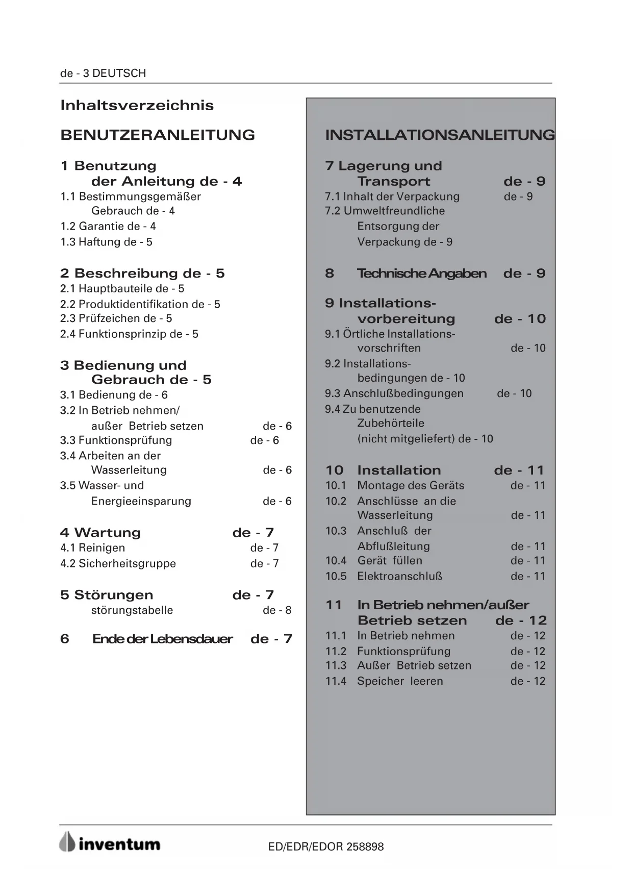 BEHOBEN WERDEN KANN!! Sorgen Sie dafür, daß Sie dabei folgende Angaben zur Hand haben: - Produktbezeichnung - Typennummer - Seriennummer Reparieren Sie das Gerät auf keinen Fall selbst. Dadurch entsteht möglicherweise eine unsichere Situation, außerdem entfällt die Garantie. 6 Ende der Lebensdauer Alle von Inventum bv benutzten Materiali- en enthalten keinerlei Stoffe, die sich bei der Demontage und/oder Vernichtung umweltschädlich auswirken. LEGIONELLEN-PRÄVENTION ! Nach längerer Abschaltung des Speichers, z.B. während des Urlaubs, müssen Sie den Speicher vor der Wiederinbetriebnahme als Vorsichtsmaßnahme gegen einen eventuellen Legionellenbefall vollständig bis auf die Maximaltemperatur aufheizen. Vor dem ersten Gebrauch nach einer längeren Stillstandszeit ist es ratsam, die Leitungen eine Minute lang durchzuspülen und dabei möglichst nicht den Duschkopf zu verwenden. ACHTUNG ! Bei Speichern, die auf eine hohe Temperatur einge- stellt sind, besteht Verbrühungsgefahr (insbesondere für Kinder). Wir empfehlen den Gebrauch einer Thermostat-Mischarmatur.258898 ED/EDR/EDOR DEUTSCH de - 8