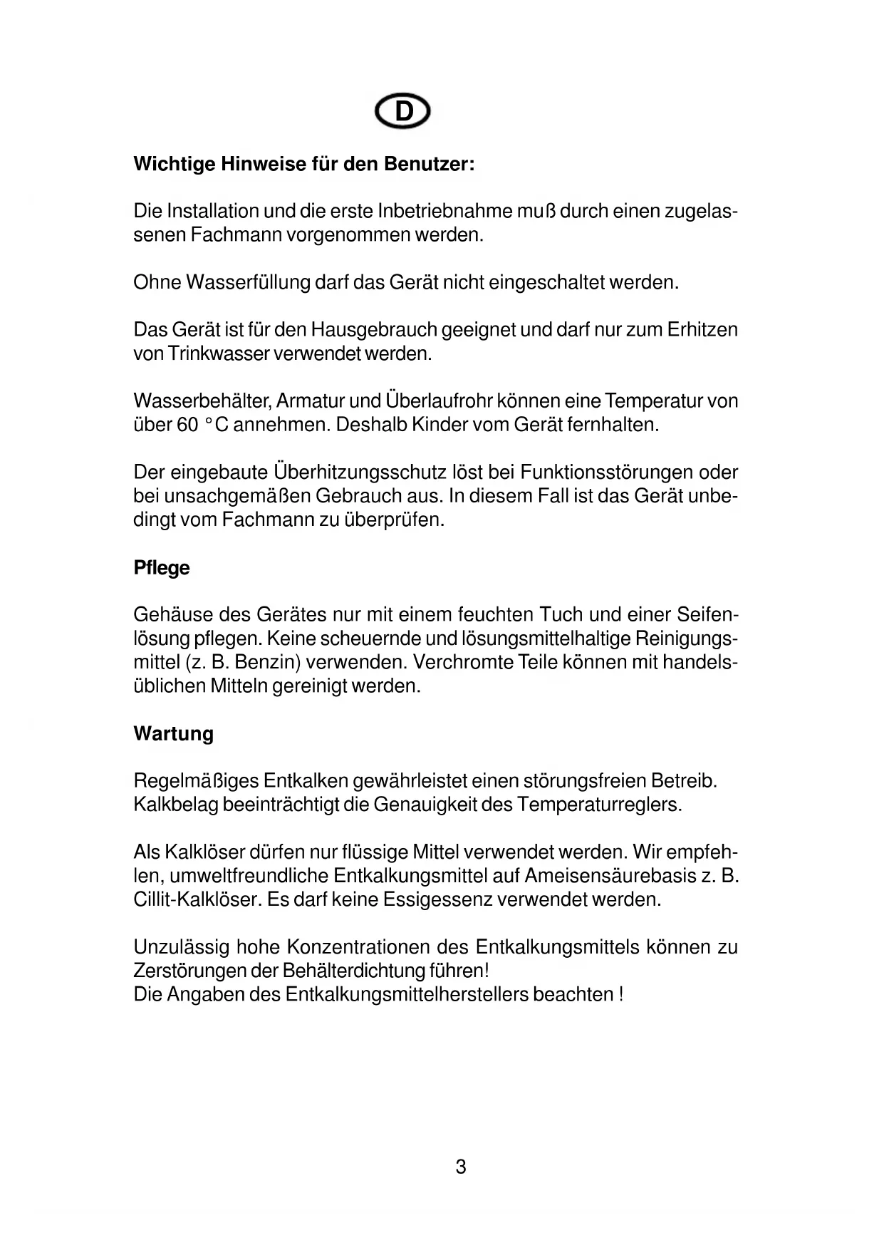 Wichtige Hinweise für den Benutzer: