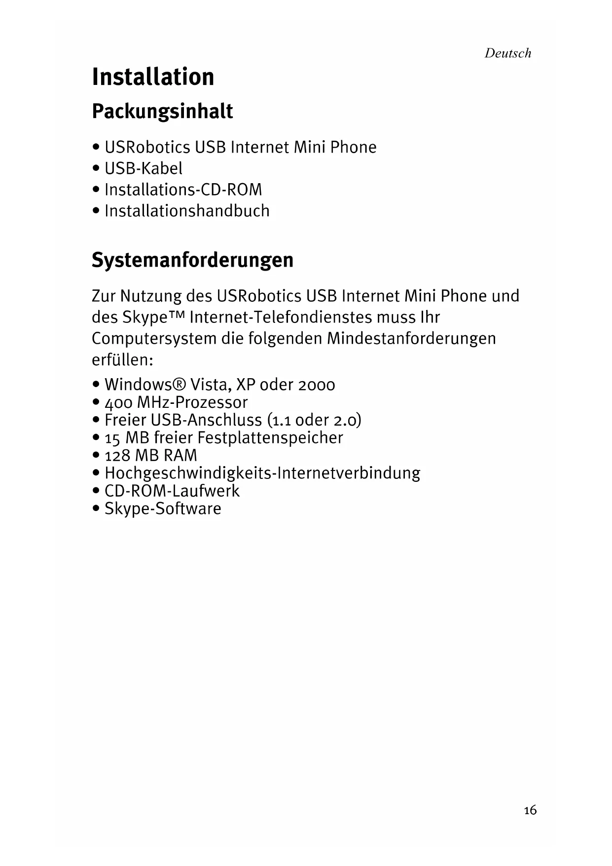 - Installationshandbuch Systemanforderungen Zur Nutzung des USRobotics USB Internet Mini Phone und des Skype™ Internet-Telefondienstes muss Ihr Computersystem die folgenden Mindestanforderungen erfüllen: