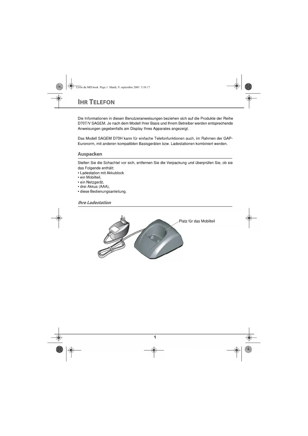 MEMO Livre du MD.book Page II Mardi, 9. septembre 2003 5:10 171 IHR TELEFON Die Informationen in diesen Benutzeranweisungen beziehen sich auf die Produkte der ReiheD70T/V SAGEM. Je nach dem Modell Ihrer Basis und Ihrem Betreiber werden entsprechendeAnweisungen gegebenfalls am Display Ihres Apparates angezeigt. Das Modell SAGEM D70H kann für einfache Telefonfunktionen auch, im Rahmen der GAP-Euronorm, mit anderen kompatiblen Basisgeräten bzw. Ladestationen kombiniert werden. Auspacken Stellen Sie die Schachtel vor sich, entfernen Sie die Verpackung und überprüfen Sie, ob siedas Folgende enthält:• Ladestation mit Akkublock• ein Mobilteil,• ein Netzgerät,• drei Akkus (AAA),• diese Bedienungsanleitung. Ihre Ladestation Platz für das MobilteilLivre du MD.book Page 1 Mardi, 9. septembre 2003 5:10 172 IHR TELEFON Das Mobilteil Geformt nach ergonomischen Prinzipien, werden Sie während Ihrer Gespräche seine Form und Qualität zu schätzen wissen. Navigationstaste zur schnellen Auswahl Displayanzeige Programmierbare Tasten Taste für Telefonbuch Auflegen Alphanumerische Tastatur Hilfe für Sehschwache Rufannahme Freisprechen Wahlwiederholung Direkter Zugriff zu SMS Lautsprecher Mikrofon Navigationstaste LED Anzeige des Empfang