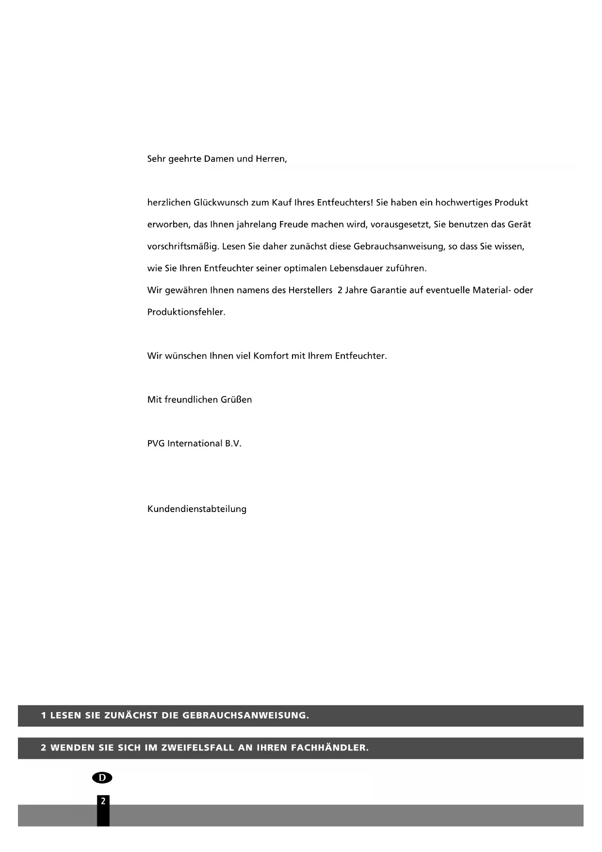 Sehr geehrte Damen und Herren, herzlichen Glückwunsch zum Kauf Ihres Entfeuchters! Sie haben ein hochwertiges Produkt erworben, das Ihnen jahrelang Freude machen wird, vorausgesetzt, Sie benutzen das Gerät vorschriftsmäßig. Lesen Sie daher zunächst diese Gebrauchsanweisung, so dass Sie wissen, wie Sie Ihren Entfeuchter seiner optimalen Lebensdauer zuführen. Wir gewähren Ihnen namens des Herstellers 2 Jahre Garantie auf eventuelle Material- oder