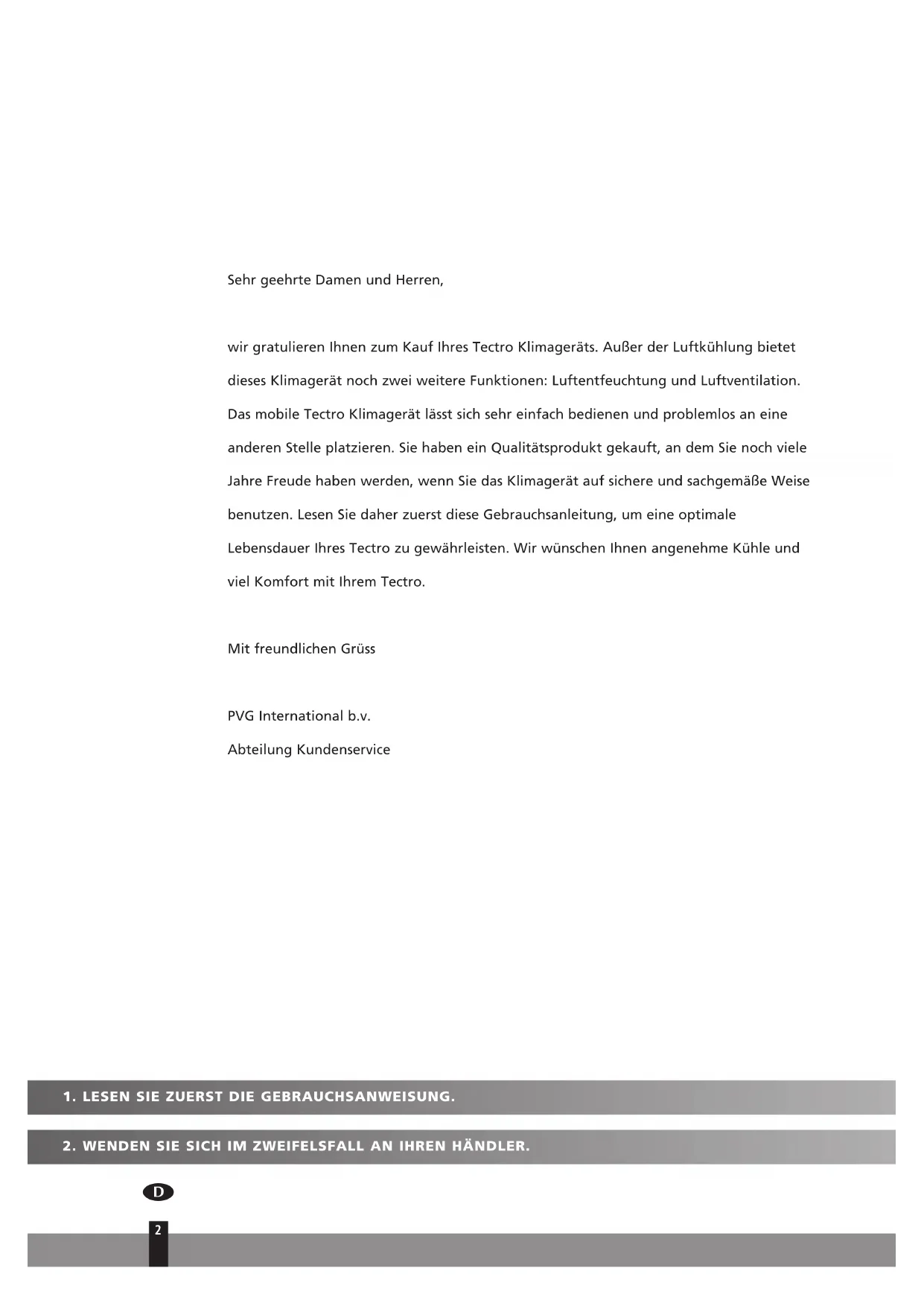 Sehr geehrte Damen und Herren, wir gratulieren Ihnen zum Kauf Ihres Tectro Klimageräts. Außer der Luftkühlung bietet dieses Klimagerät noch zwei weitere Funktionen: Luftentfeuchtung und Luftventilation. Das mobile Tectro Klimagerät lässt sich sehr einfach bedienen und problemlos an eine anderen Stelle platzieren. Sie haben ein Qualitätsprodukt gekauft, an dem Sie noch viele Jahre Freude haben werden, wenn Sie das Klimagerät auf sichere und sachgemäße Weise benutzen. Lesen Sie daher zuerst diese Gebrauchsanleitung, um eine optimale Lebensdauer Ihres Tectro zu gewährleisten. Wir wünschen Ihnen angenehme Kühle und viel Komfort mit Ihrem Tectro. Mit freundlichen Grüss PVG International b.v. Abteilung Kundenservice2