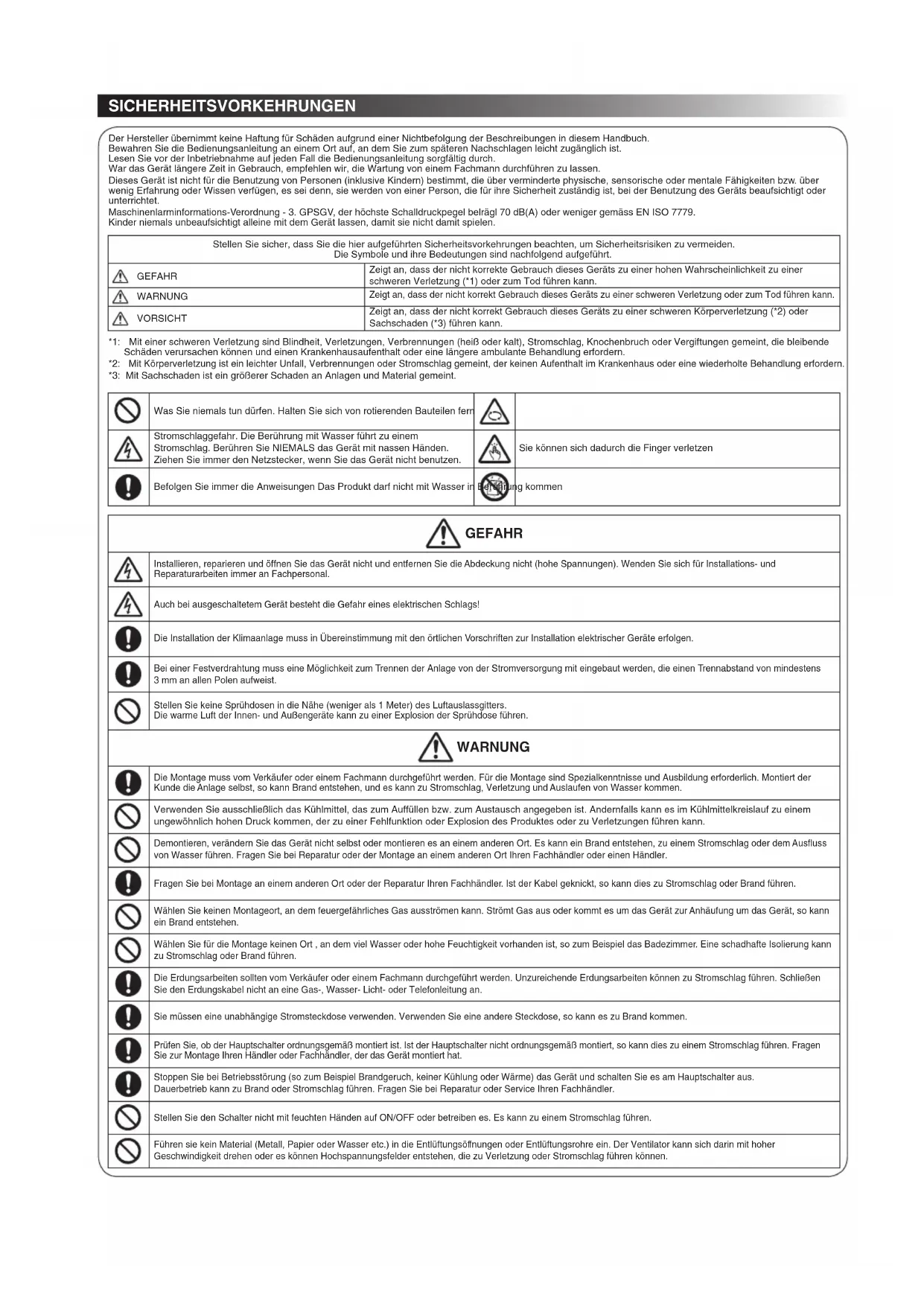 ITSICHERHEITSVORKEHRUNGEN Der Hersteller übernimmt keine Haftung für Schäden aufgrund einer Nichtbefolgung der Beschreibungen in diesem Handbuch. Bewahren Sie die Bedienungsanleitung an einem Ort auf, an dem Sie zum späteren Nachschlagen leicht zugänglich ist. Lesen Sie vor der Inbetriebnahme auf jeden Fall die Bedienungsanleitung sorgfältig durch. War das Gerät längere Zeit in Gebrauch, empfehlen wir, die Wartung von einem Fachmann durchführen zu lassen. Dieses Gerät ist nicht für die Benutzung von Personen (inklusive Kindern) bestimmt, die über verminderte physische, sensorische oder mentale Fähigkeiten bzw. über wenig Erfahrung oder Wissen verfügen, es sei denn, sie werden von einer Person, die für ihre Sicherheit zuständig ist, bei der Benutzung des Geräts beaufsichtigt oder unterrichtet. Maschinenlarminformations-Verordnung - 3. GPSGV, der höchste Schalldruckpegel belrägl 70 dB(A) oder weniger gemäss EN ISO 7779. Kinder niemals unbeaufsichtigt alleine mit dem Gerät lassen, damit sie nicht damit spielen. Stellen Sie sicher, dass Sie die hier aufgeführten Sicherheitsvorkehrungen beachten, um Sicherheitsrisiken zu vermeiden. Die Symbole und ihre Bedeutungen sind nachfolgend aufgeführt. GEFAHR Zeigt an, dass der nicht korrekte Gebrauch dieses Geräts zu einer hohen Wahrscheinlichkeit zu einer schweren Verletzung (*1) oder zum Tod führen kann. WARNUNG Zeigt an, dass der nicht korrekt Gebrauch dieses Geräts zu einer schweren Verletzung oder zum Tod führen kann. VORSICHT Zeigt an, dass der nicht korrekt Gebrauch dieses Geräts zu einer schweren Körperverletzung (*2) oder Sachschaden (*3) führen kann. Was Sie niemals tun dürfen. Halten Sie sich von rotierenden Bauteilen fern Stromschlaggefahr. Die Berührung mit Wasser führt zu einem Stromschlag. Berühren Sie NIEMALS das Gerät mit nassen Händen. Ziehen Sie immer den Netzstecker, wenn Sie das Gerät nicht benutzen. Sie können sich dadurch die Finger verletzen Befolgen Sie immer die Anweisungen Das Produkt darf nicht mit Wasser in Berührung kommen GEFAHR Installieren, reparieren und öffnen Sie das Gerät nicht und entfernen Sie die Abdeckung nicht (hohe Spannungen). Wenden Sie sich für Installations- und Reparaturarbeiten immer an Fachpersonal. Auch bei ausgeschaltetem Gerät besteht die Gefahr eines elektrischen Schlags! Die Installation der Klimaanlage muss in Übereinstimmung mit den örtlichen Vorschriften zur Installation elektrischer Geräte erfolgen. Bei einer Festverdrahtung muss eine Möglichkeit zum Trennen der Anlage von der Stromversorgung mit eingebaut werden, die einen Trennabstand von mindestens 3 mm an allen Polen aufweist. Stellen Sie keine Sprühdosen in die Nähe (weniger als 1 Meter) des Luftauslassgitters. Die warme Luft der Innen- und Außengeräte kann zu einer Explosion der Sprühdose führen. WARNUNG Die Montage muss vom Verkäufer oder einem Fachmann durchgeführt werden. Für die Montage sind Spezialkenntnisse und Ausbildung erforderlich. Montiert der Kunde die Anlage selbst, so kann Brand entstehen, und es kann zu Stromschlag, Verletzung und Auslaufen von Wasser kommen. Verwenden Sie ausschließlich das Kühlmittel, das zum Auffüllen bzw. zum Austausch angegeben ist. Andernfalls kann es im Kühlmittelkreislauf zu einem ungewöhnlich hohen Druck kommen, der zu einer Fehlfunktion oder Explosion des Produktes oder zu Verletzungen führen kann. Demontieren, verändern Sie das Gerät nicht selbst oder montieren es an einem anderen Ort. Es kann ein Brand entstehen, zu einem Stromschlag oder dem Ausfluss von Wasser führen. Fragen Sie bei Reparatur oder der Montage an einem anderen Ort Ihren Fachhändler oder einen Händler. Fragen Sie bei Montage an einem anderen Ort oder der Reparatur Ihren Fachhändler. Ist der Kabel geknickt, so kann dies zu Stromschlag oder Brand führen. Wählen Sie keinen Montageort, an dem feuergefährliches Gas ausströmen kann. Strömt Gas aus oder kommt es um das Gerät zur Anhäufung um das Gerät, so kann ein Brand entstehen. Wählen Sie für die Montage keinen Ort , an dem viel Wasser oder hohe Feuchtigkeit vorhanden ist, so zum Beispiel das Badezimmer. Eine schadhafte Isolierung kann zu Stromschlag oder Brand führen. Die Erdungsarbeiten sollten vom Verkäufer oder einem Fachmann durchgeführt werden. Unzureichende Erdungsarbeiten können zu Stromschlag führen. Schließen Sie den Erdungskabel nicht an eine Gas-, Wasser- Licht- oder Telefonleitung an. Sie müssen eine unabhängige Stromsteckdose verwenden. Verwenden Sie eine andere Steckdose, so kann es zu Brand kommen. Prüfen Sie, ob der Hauptschalter ordnungsgemäß montiert ist. Ist der Hauptschalter nicht ordnungsgemäß montiert, so kann dies zu einem Stromschlag führen. Fragen Sie zur Montage Ihren Händler oder Fachhändler, der das Gerät montiert hat. Stoppen Sie bei Betriebsstörung (so zum Beispiel Brandgeruch, keiner Kühlung oder Wärme) das Gerät und schalten Sie es am Hauptschalter aus. Dauerbetrieb kann zu Brand oder Stromschlag führen. Fragen Sie bei Reparatur oder Service Ihren Fachhändler. Stellen Sie den Schalter nicht mit feuchten Händen auf ON/OFF oder betreiben es. Es kann zu einem Stromschlag führen. Führen sie kein Material (Metall, Papier oder Wasser etc.) in die Entlüftungsöffnungen oder Entlüftungsrohre ein. Der Ventilator kann sich darin mit hoher Geschwindigkeit drehen oder es können Hochspannungsfelder entstehen, die zu Verletzung oder Stromschlag führen können. *1: Mit einer schweren Verletzung sind Blindheit, Verletzungen, Verbrennungen (heiß oder kalt), Stromschlag, Knochenbruch oder Vergiftungen gemeint, die bleibende Schäden verursachen können und einen Krankenhausaufenthalt oder eine längere ambulante Behandlung erfordern. *2: Mit Körperverletzung ist ein leichter Unfall, Verbrennungen oder Stromschlag gemeint, der keinen Aufenthalt im Krankenhaus oder eine wiederholte Behandlung erfordern. *3: Mit Sachschaden ist ein größerer Schaden an Anlagen