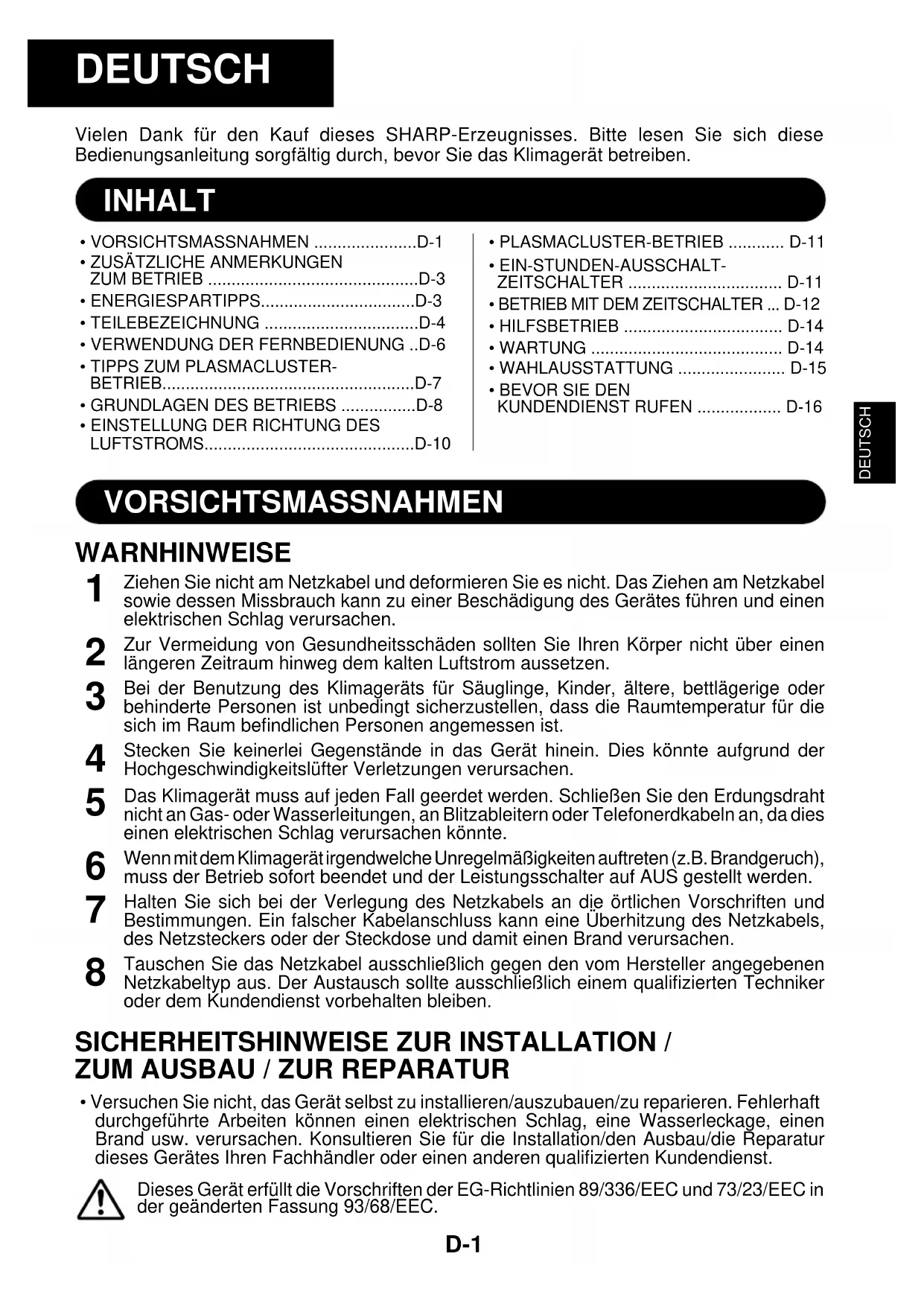 - PLASMACLUSTER-BETRIEB ............ D-11• EIN-STUNDEN-AUSSCHALT-ZEITSCHALTER ................................. D-11• BETRIEB MIT DEM ZEITSCHALTER ... D-12• HILFSBETRIEB .................................. D-14• WARTUNG ......................................... D-14• WAHLAUSSTATTUNG ....................... D-15• BEVOR SIE DENKUNDENDIENST RUFEN .................. D-16 VORSICHTSMASSNAHMEN WARNHINWEISE