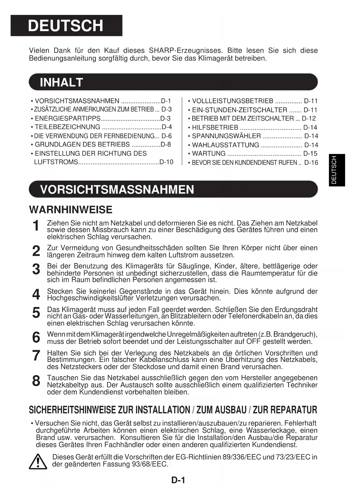 Vielen Dank für den Kauf these SHARP-Erzeugnisses.itte lessen Sie sich diese Bedienungsanleitung sorgfältig durch, bevor Sie das Klimagerat betreiben.