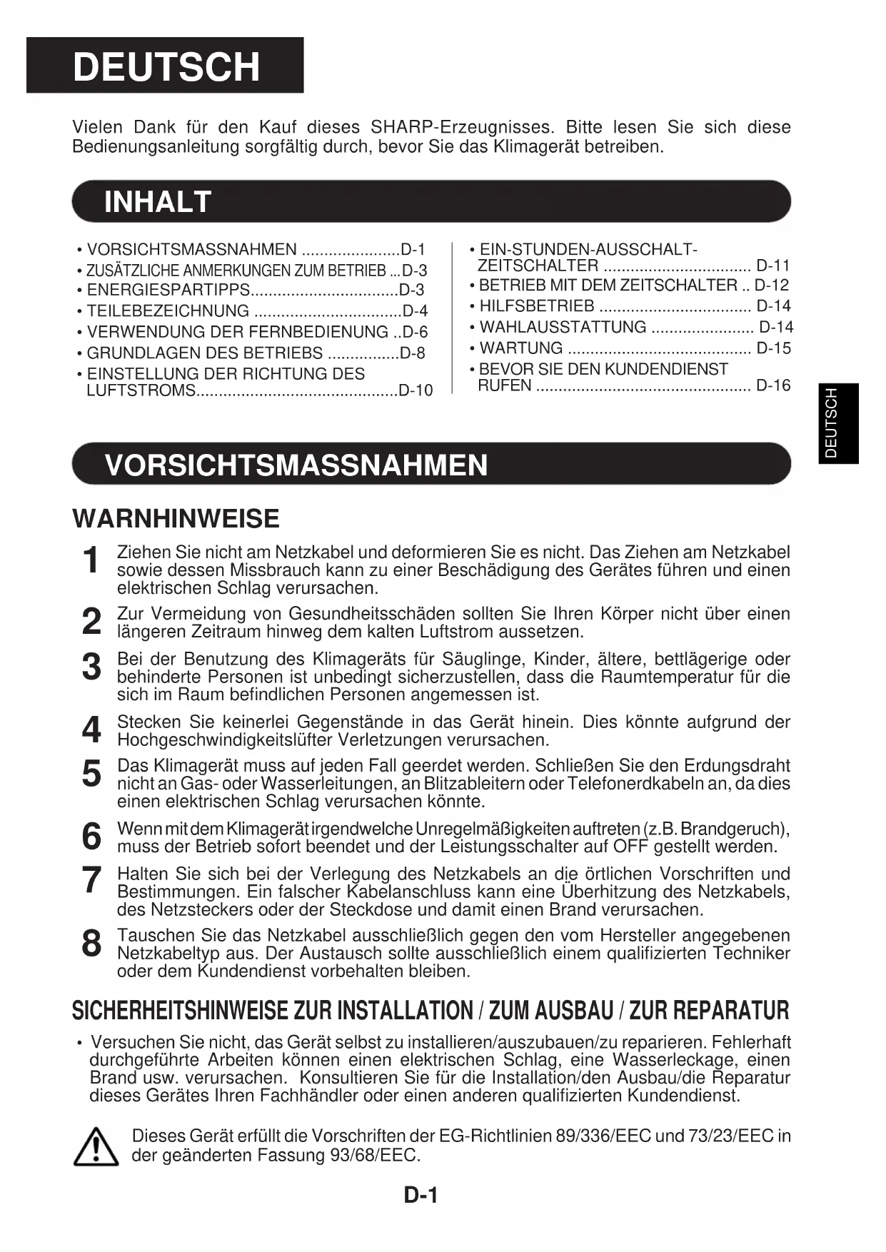 - In the HEAT operation, water vapour may flow out of the outdoor unit dur- ing de-icing. (Only in models AY- A07BE/AY-A09BE/AY-A12BE) Please call for service when OPERATION Lamp and TIMER Lamp on the indicator panel blink.DEUTSCH D-1 Vielen Dank für den Kauf dieses SHARP-Erzeugnisses. Bitte lesen Sie sich dieseBedienungsanleitung sorgfältig durch, bevor Sie das Klimagerät betreiben.• VORSICHTSMASSNAHMEN ......................D-1 ZUSÄTZLICHE ANMERKUNGEN ZUM BETRIEB ... D-3