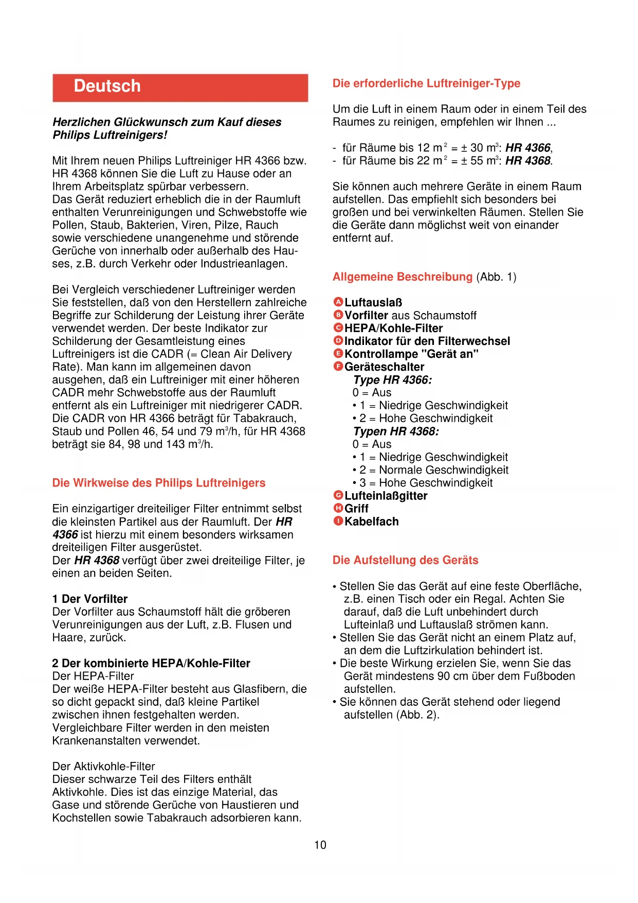 Spécifications/données techniquesHerzlichen Glückwunsch zum Kauf dieses Philips Luftreinigers! Mit Ihrem neuen Philips Luftreiniger HR 4366 bzw. HR 4368 können Sie die Luft zu Hause oder an Ihrem Arbeitsplatz spürbar verbessern. Das Gerät reduziert erheblich die in der Raumluft enthalten Verunreinigungen und Schwebstoffe wie Pollen, Staub, Bakterien, Viren, Pilze, Rauch sowie verschiedene unangenehme und störende Gerüche von innerhalb oder außerhalb des Hau- ses, z.B. durch Verkehr oder Industrieanlagen. Bei Vergleich verschiedener Luftreiniger werden Sie feststellen, daß von den Herstellern zahlreiche Begriffe zur Schilderung der Leistung ihrer Geräte verwendet werden. Der beste Indikator zur Schilderung der Gesamtleistung eines Luftreinigers ist die CADR (= Clean Air Delivery Rate). Man kann im allgemeinen davon ausgehen, daß ein Luftreiniger mit einer höheren CADR mehr Schwebstoffe aus der Raumluft entfernt als ein Luftreiniger mit niedrigerer CADR. Die CADR von HR 4366 beträgt für Tabakrauch, Staub und Pollen 46, 54 und 79 m