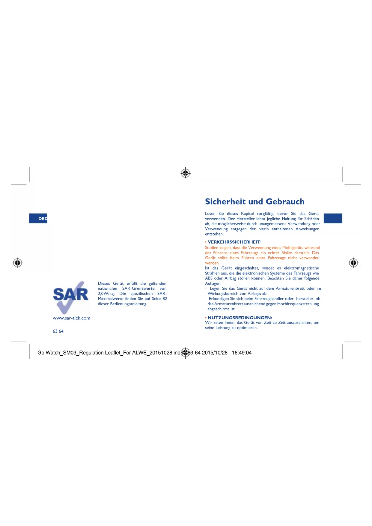- NUTZUNGSBEDINGUNGEN: Wir raten Ihnen, das Gerät von Zeit zu Zeit auszuschalten, um seine Leistung zu optimieren. Go Watch_SM03_Regulation Leaflet_For ALWE_20151028.indd 63-64 2015/10/28 16:49:04DE DE