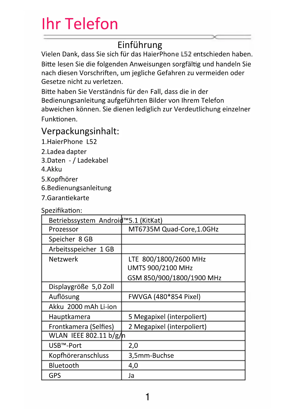 Fall, dass die in der Bedienungsanleitung aufgeführten Bilder von Ihrem Telefon abweichen können. Sie dienen lediglich zur Verdeutlichung einzelner Funkonen. Verpackungsinhalt: 1.HaierPhone L52 2.Ladea dapter 3.Daten - / Ladekabel 4.Akku 5.Kopörer 6.Bedienungsanleitung 7.Garanekarte