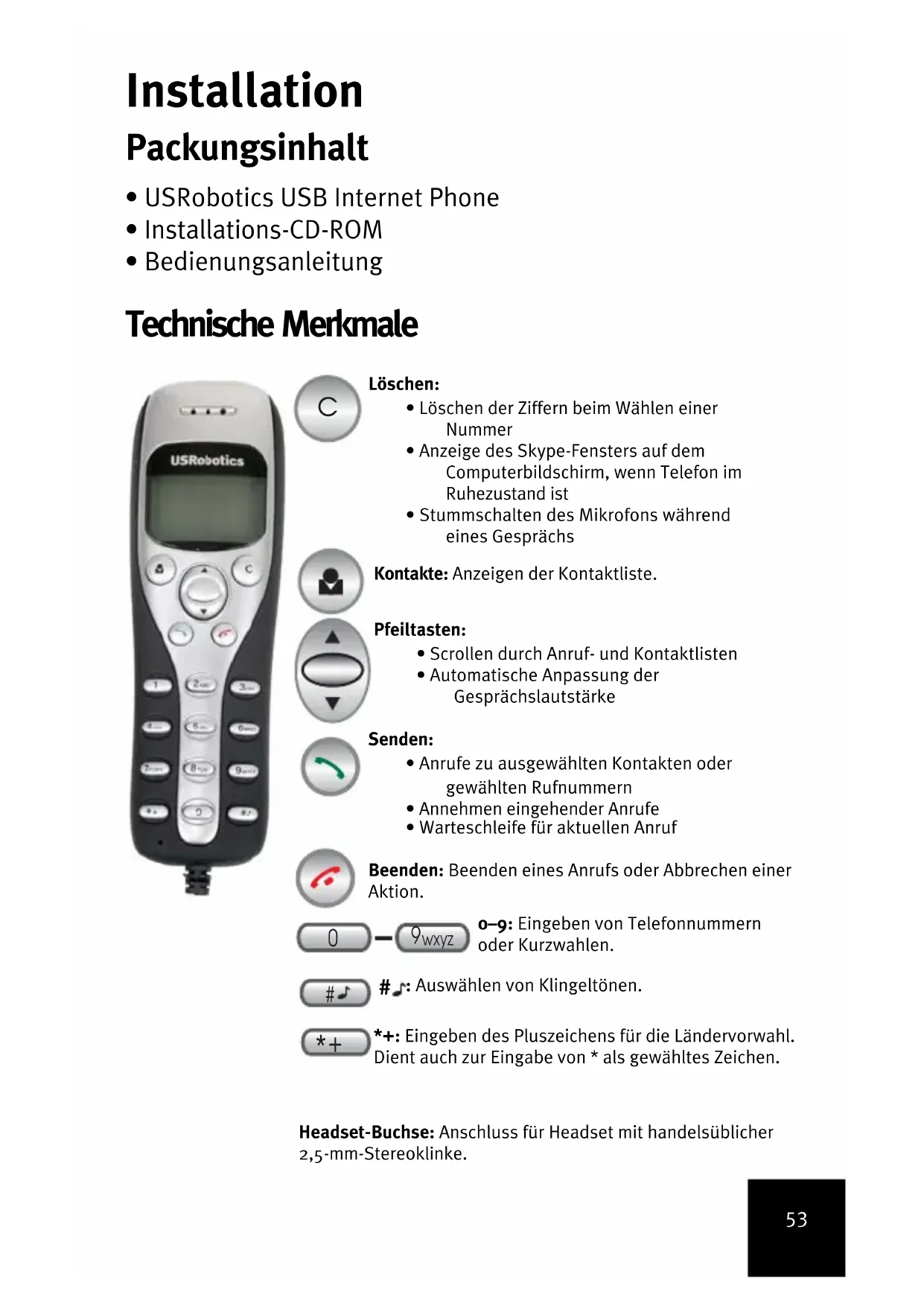 Pfeiltasten: • Scrollen durch Anruf- und Kontaktlisten• Automatische Anpassung der Gesprächslautstärke #54 Systemanforderungen Zur Nutzung des USRobotics USB Internet Phone und des Skype™ Internet-Telefondienstes muss Ihr Computersystem die folgenden Mindestanforderungen erfüllen:
