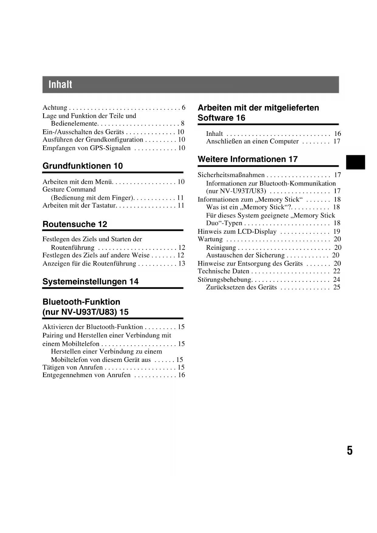 - IN VERBINDUNG DAMIT AUFTRETEN. Entsorgung von gebrauchten Batterien und Akkumulatoren (anzuwenden in den Ländern der Europäischen Union und anderen europäischen Ländern mit einem separaten Sammelsystem für diese Produkte) Das Symbol auf der Batterie/Akkumulator oder der Verpackung weist darauf hin, daß diese nicht als normaler Haushaltsabfall zu behandeln sind. Durch Ihren Beitrag zum korrekten Entsorgen dieser Batterien/Akkumulatoren schützen Sie die Umwelt und die Gesundheit Ihrer Mitmenschen. Umwelt und Gesundheit werden durch falsches Entsorgen gefährdet. Materialrecycling hilft, den Verbrauch von Rohstoffen zu verringern. Bei Produkten die auf Grund ihrer Sicherheit, der Funktionalität oder als Sicherung vor Datenverlust eine ständige Verbindung zur eingebauten Batterie bedürfen, sollte die Batterie nur durch qualifiziertes Servicepersonal ausgetauscht werden. Um sicherzustellen, daß die Batterie korrekt entsorgt wird, geben sie das Produkt zwecks Entsorgung an einer Annahmestelle für das Recycling von elektrischen und elektronischen Geräten ab. Für alle anderen Batterien entnehmen Sie bitte die Batterie entsprechend dem Kapitel über die sichere Entfernung der Batterie. Geben Sie die Batterie an einer Annahmestelle für das Recycling von Batterien/Akkumulatoren ab. Weitere Informationen über das Recycling dieses Produkts oder der Batterie erhalten Sie von Ihrer Gemeinde, den kommunalen Entsorgungsbetrieben oder dem Geschäft, in dem Sie das Produkt gekauft haben. Hiermit erklärt Sony Corp., dass sich die Modelle NV-U93T/U83 in Übereinstimmung mit den grundlegenden Anforderungen und den anderen relevanten Vorschriften der Richtlinie 1999/5/EG befinden. Weitere Informationen erhältlich unter: http://www.compliance.sony.de/ Die Verwendung dieses Funkgeräts ist in einem Umkreis von 20 km um das Zentrum von Ny- Ålesund, Svalbard (Norwegen), nicht erlaubt. Der Hersteller dieses Produkts ist Sony Corporation, 1-7-1 Konan, Minato-ku, Tokio, 108-0075, Japan. Autorisierter Vertreter für EMV und Produktsicherheit ist die Sony Deutschland GmbH, Hedelfinger Strasse 61, 70327 Stuttgart, Deutschland. Für Fragen im Zusammenhang mit Kundendienst oder Garantie wenden Sie sich bitte an die in den separaten Kundendienst- oder Garantieunterlagen genannten Adressen.45 Inhalt Achtung p. 6