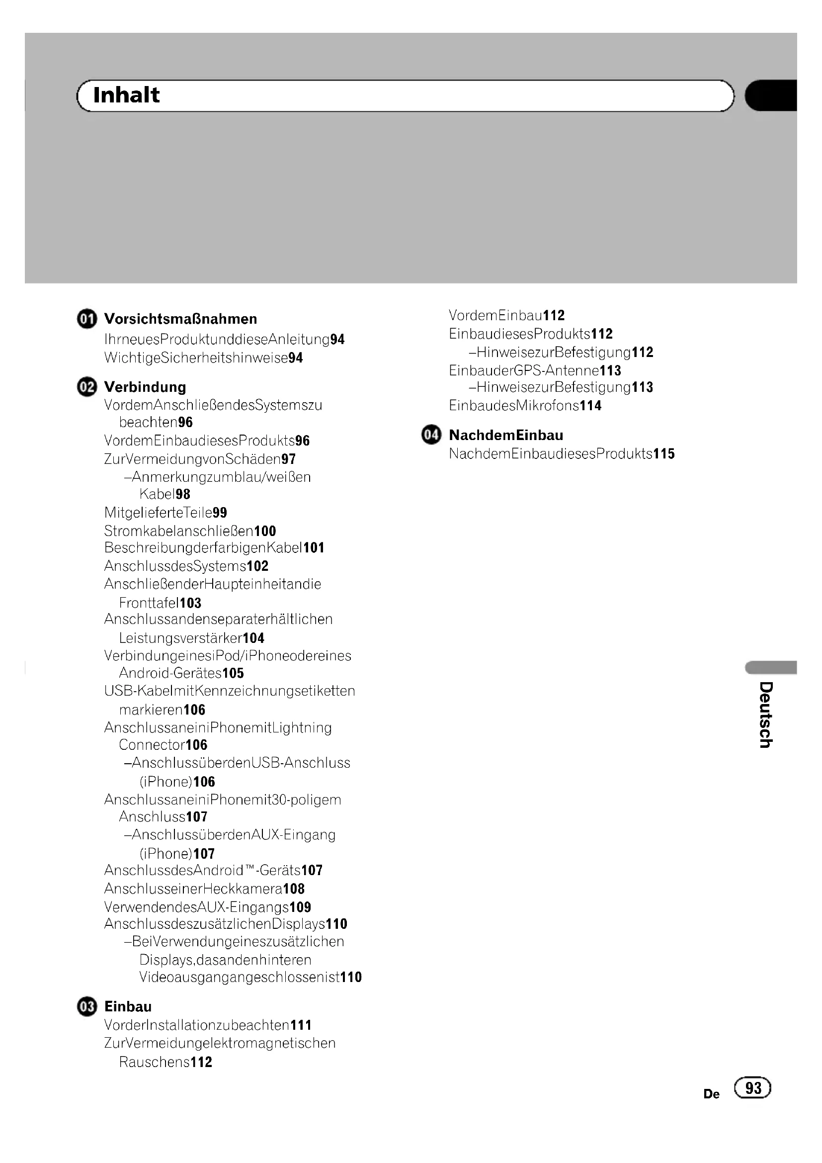 Después de la instalaciónBlack plate (93,1) Vorsichtsmaßnahmen Ihr neues Produkt und diese Anleitung 94 Wichtige Sicherheitshinweise 94 Verbindung Vor dem Anschließen des Systems zu beachten 96 Vor dem Einbau dieses Produkts 96 Zur Vermeidung von Schäden 97 – Anmerkung zum blau/weißen Kabel 98 Mitgelieferte Teile 99 Stromkabel anschließen 100 Beschreibung der farbigen Kabel 101 Anschluss des Systems 102 Anschließen der Haupteinheit an die Fronttafel 103 Anschluss an den separat erhältlichen Leistungsverstärker 104 Verbindung eines iPod/iPhone oder eines Android-Gerätes 105 USB-Kabel mit Kennzeichnungsetiketten markieren 106 Anschluss an ein iPhone mit Lightning Connector 106 – Anschluss über den USB-Anschluss (iPhone) 106 Anschluss an ein iPhone mit 30-poligem Anschluss 107 – Anschluss über den AUX-Eingang (iPhone) 107 Anschluss des Android™-Geräts 107 Anschluss einer Heckkamera 108 Verwenden des AUX-Eingangs 109 Anschluss des zusätzlichen Displays 110 – Bei Verwendung eines zusätzlichen Displays, das an den hinteren Videoausgang angeschlossen ist 110 Einbau Vor der Installation zu beachten 111 Zur Vermeidung elektromagnetischen Rauschens 112 Vor dem Einbau 112 Einbau dieses Produkts 112 – Hinweise zur Befestigung 112 Einbau der GPS-Antenne 113 – Hinweise zur Befestigung 113 Einbau des Mikrofons 114 Nach dem Einbau Nach dem Einbau dieses Produkts 115 <CRD4965-A>93