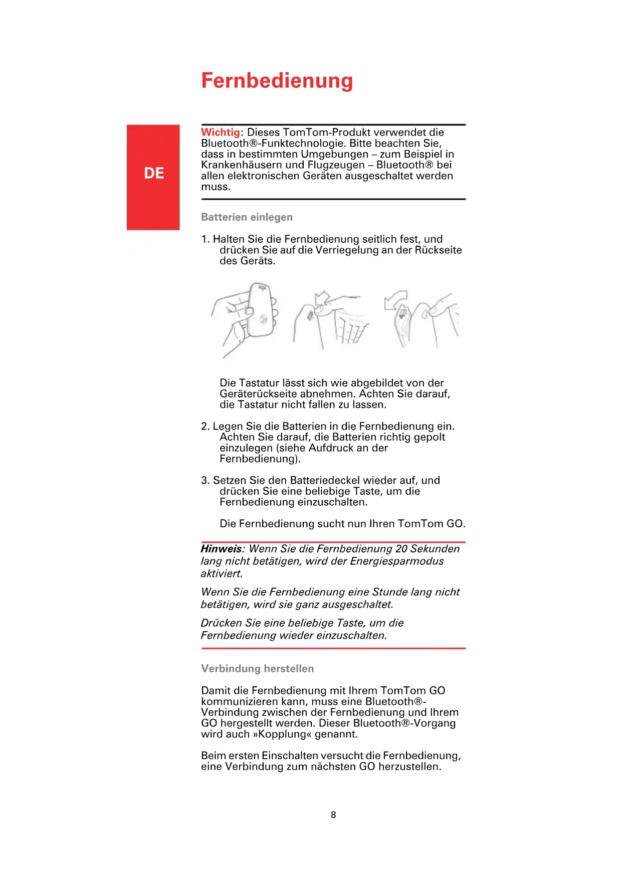 Fernbedi- enung Wichtig: Dieses TomTom-Produkt verwendet die Bluetooth®-Funktechnologie. Bitte beachten Sie, dass in bestimmten Umgebungen – zum Beispiel in Krankenhäusern und Flugzeugen – Bluetooth® bei allen elektronischen Geräten ausgeschaltet werden muss. Batterien einlegen
