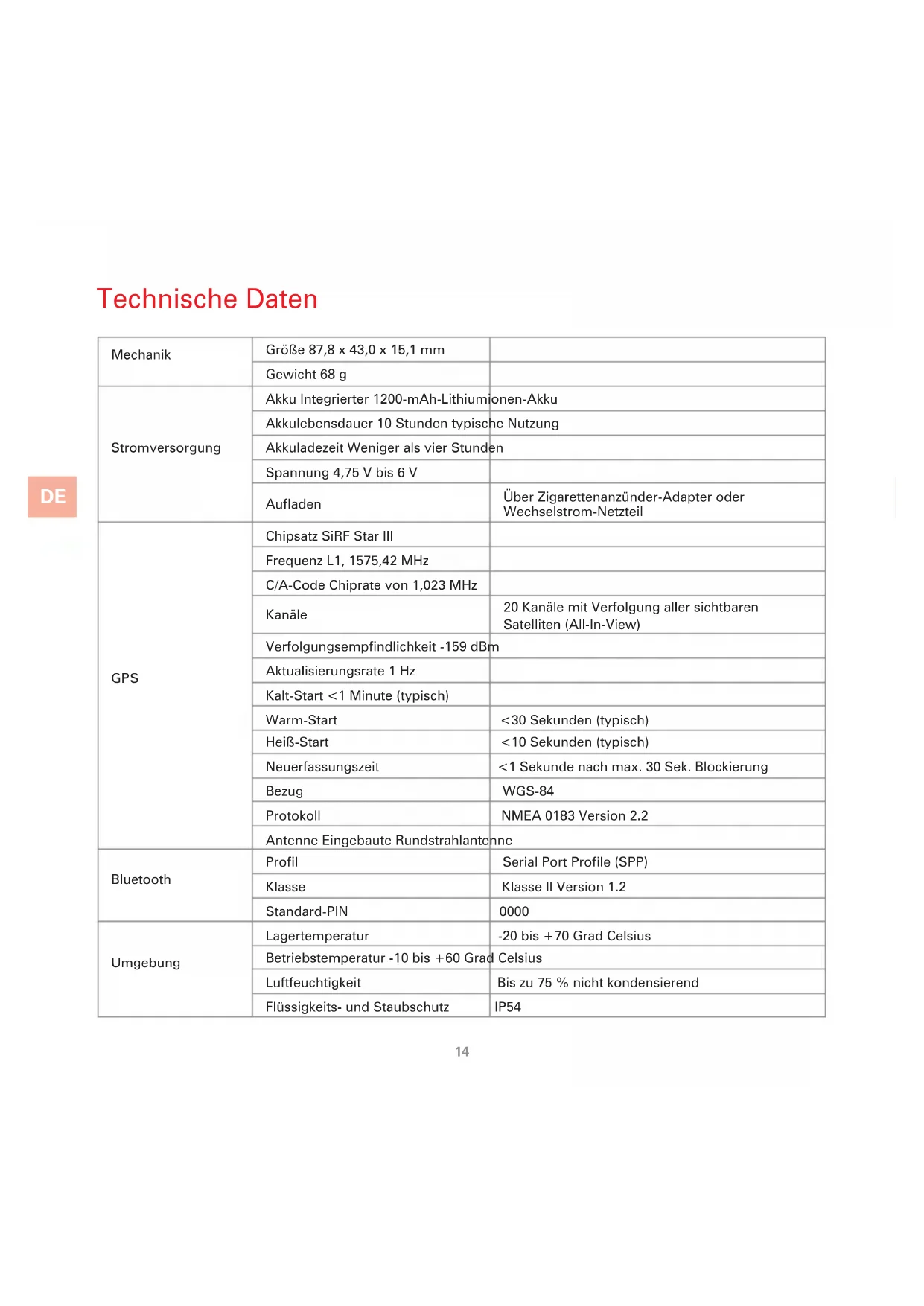Technische Daten Mechanik Größe 87,8 x 43,0 x 15,1 mm Gewicht 68 g Stromversorgung Akku Integrierter 1200-mAh-Lithiumionen-Akku Akkulebensdauer 10 Stunden typische Nutzung Akkuladezeit Weniger als vier Stunden Spannung 4,75 V bis 6 V Auaden Über Zigarettenanzünder-Adapter oder Wechselstrom-Netzteil GPS Chipsatz SiRF Star III Frequenz L1, 1575,42 MHz C/A-Code Chiprate von 1,023 MHz Kanäle 20 Kanäle mit Verfolgung aller sichtbaren Satelliten (All-In-View) Verfolgungsempndlichkeit -159 dBm Aktualisierungsrate 1 Hz Kalt-Start <1 Minute (typisch) Warm-Start <30 Sekunden (typisch) Heiß-Start <10 Sekunden (typisch) Neuerfassungszeit <1 Sekunde nach max. 30 Sek. Blockierung Bezug WGS-84 Protokoll NMEA 0183 Version 2.2 Antenne Eingebaute Rundstrahlantenne Bluetooth Prol Serial Port Prole (SPP) Klasse Klasse II Version 1.2 Standard-PIN 0000 Umgebung Lagertemperatur -20 bis +70 Grad Celsius Betriebstemperatur -10 bis +60 Grad Celsius Luftfeuchtigkeit Bis zu 75 % nicht kondensierend Flüssigkeits- und Staubschutz IP5414
