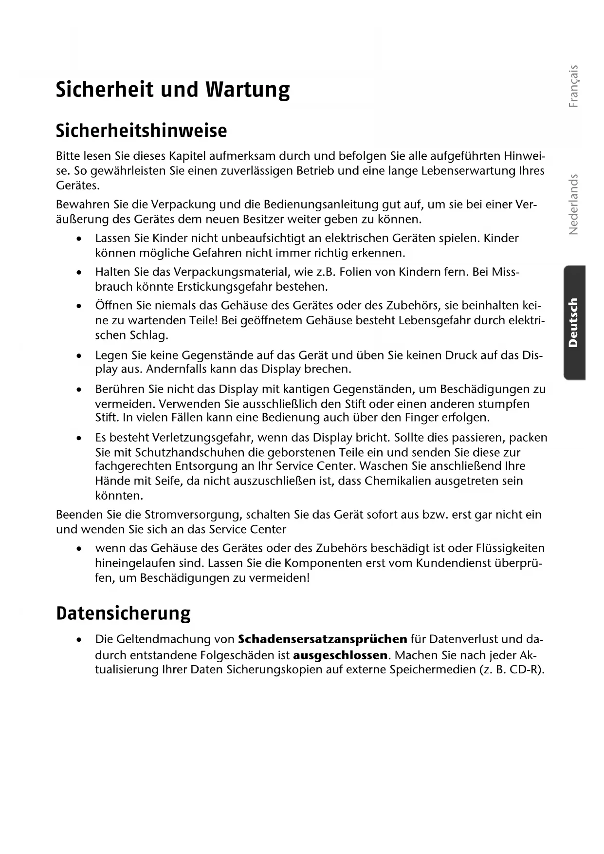 Vervielfältigung dieses Handbuchs Dieses Dokument enthält gesetzlich geschützte Informationen. Alle Rechte vorbehalten. Vervielfältigung in mechanischer, elektronischer und jeder anderen Form ohne die schriftli- che Genehmigung des Herstellers ist verboten.Deutsch Nederlands Français Sicherheit und Wartung Sicherheitshinweise Bitte lesen Sie dieses Kapitel aufmerksam durch und befolgen Sie alle aufgeführten Hinwei- se. So gewährleisten Sie einen zuverlässigen Betrieb und eine lange Lebenserwartung Ihres Gerätes. Bewahren Sie die Verpackung und die Bedienungsanleitung gut auf, um sie bei einer Ver- äußerung des Gerätes dem neuen Besitzer weiter geben zu können.