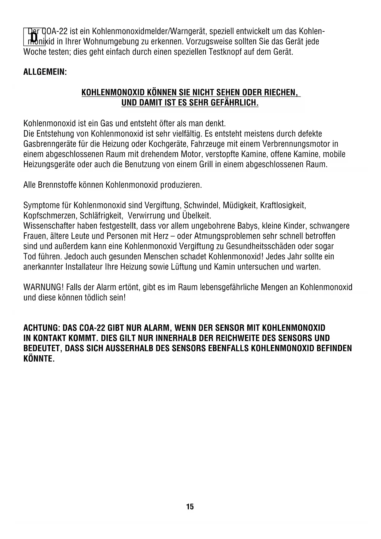 - Platzieren Sie den Melder nicht hinter Vorhängen oder andere Möbel. Auch sollten Sie den Melder nicht fl ach auf einen fl achen Untergrund hinlegen.17 INSTALLATIONS INFORMATION: Platzieren Sie die Montageplatte auf einen geeigneten Platz, mithilfe von Dübeln und Schrauben. Dies muss an der Wand sein. Platzieren Sie eine Batterie im Gerät und drehen Sie das Gerät auf der Platte. Warten Sie ca. 120 Sekunden bevor Sie das Gerät testen. Hierzu betätigen Sie den Testknopf. Verwendung: Der CO-Melder/Warngerät ist betriebsbereit 120 Sekunden nachdem Sie die Batterie (9V) plat- ziert haben und der Melder an Wand montiert wurde. Nur wenn eine Batterie eingesetzt ist, ist es möglich, das Gerät auf der Montageplatte zu positionieren. Die grüne LED wird alle 30 Sekunden aufl euchten, um zu signalisieren, dass das Gerät funktioniert. Falls das Gerät Kohlenmonoxid ent- deckt, wird ein Alarm ertönen und die rote LED wird blinken. Falls das Kohlenmonoxid verschwun- den ist, stoppt der Alarm automatisch.Sie können bei einem Alarm den Testknopf drücken, um den Alarm leiser zu machen. Die rote LED wird weiterhin blinken. Speicherfunktion: Falls bei Abwesendheit ein Alarm ertönte, ist dies sichtbar, indem Sie den Testknopf gedrückt halten. Blinkt die grüne LED (3 Mal pro Sekunde) gab es einen Alarm. Sie können die Taste wieder loslassen und der Alarm stoppt. Drücken Sie nochmals die Testtaste, und das Gerät funktioniert wieder normal (alternativ können Sie auch eine Minute warten). Reset: Um das Gerät zu resetten, entnehmen Sie für minimal 10 Sekunden die Batterie vom Gerät. Ertönt nach dem Reset trotzdem der Alarm bedeutet dies, dass die Konzentration von Kohlenmonoxid zu hoch ist! Testen: Drücken Sie die ‚Test‘ Taste. Der Kohlenmonoxid Melder wird 2 Mal ein Signal geben. Die rote LED blinkt. Solange man die ‘Test’ Taste gedrückt hält, wiederholt sich dies. Es ist zu empfehlen, Ihr Gerät wöchentlich kurz zu testen. Funktioniert das Gerät nicht wie beschrie- ben, sollten Sie die Batterie austauschen und 120 Sekunden warten, bevor man das Gerät erneut testet. Fehlermeldung: Falls das Gerät, während des Tests, einen Fehler am Sensor entdeckt, werden sowohl die gelbe als auch die rote LED leuchten. Führen Sie ein Reset durch. Falls das Problem trotzdem nicht behoben ist, ist der Sensor defekt und muss ersetzt werden. Test ALARM FAULT POWER18 ALARM Falls der Kohlenmonixid Warner einen Alarm gibt, ist wahrscheinlich eine hohe Menge Kohlenmo- noxid in Ihrer Umgebung. Bitte handeln Sie augenblicklich, da Kohlenmonoxid sehr gefährlich und tödlich sein kann!! Was müssen Sie tun, falls der Alarm ertönt? 1 Öffnen Sie Türen und Fenster und gehen Sie sofort nach draußen. Kontrollieren Sie, ob alle Personen das Haus verlassen haben. 2 Rufen Sie Ihren Installateur an, um die Heizung, Belüftung und den Kamin kontrollieren zu lassen und herauszufi nden, ob diese die Ursache für den Kohlenmonoxid Alarm waren. Gehen Sie nur wieder herein, falls die Menge an Kohlenmonoxid nicht mehr hoch ist und die Ursache für die Entwicklung des Kohlenmonoxids bekannt ist. Sorgen Sie zur Sicherheit für eine gute Belüftung. Der Alarmton kann durch drücken der ‚Test‘ taste ausgeschaltet werden. LED ANZEIGE: Rote LED Alarm, Kohlenmonoxid ist anwesend Grüne LED Normale Funktion, alle 30 Sekunden leuchtet die LED kurz auf Gelbe LED Es gibt ein Problem mit dem Sensor ERSETZEN SENSOR/PRODUKT: Der Sensor hat einen Lebensdauer von ca. 5 Jahre. Nach dieser Zeit sollten Sie das Produkt erset- zen, da der Sensor nicht austauschbar ist. Falls die gelbe LED innerhalb der 5 Jahre aufl euchtet, und die Batterie aufgeladen ist, dann ist dies ein Zeichen, dass der Sensor nicht fehlerfrei funktioniert. Sie sollten das Produkt dann austauschen WARTUNG: Ihr Kohlenmonoxid Melder braucht regelmäßige Pfl ege: