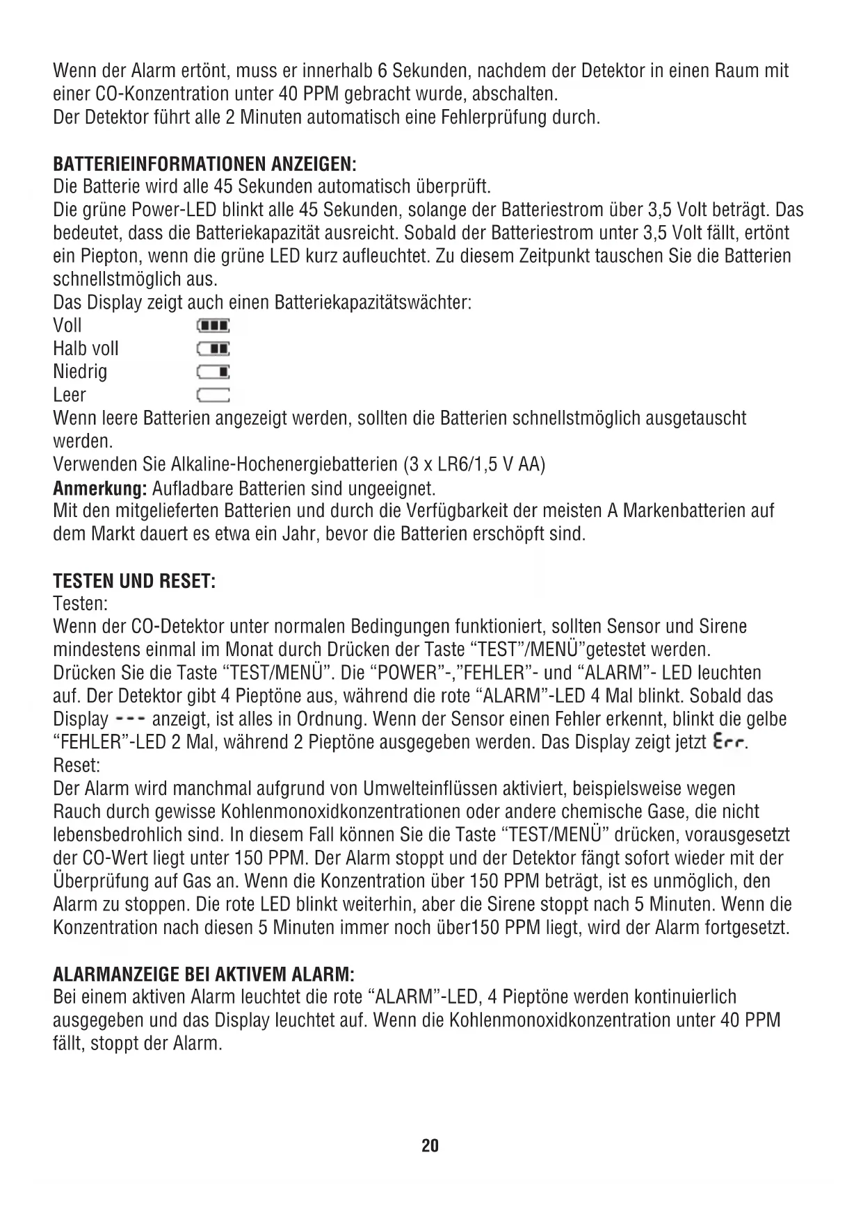- Installieren Sie den CO-Detektor niemals in Räumen mit Temperaturen unter 0°C oder über 45°C und einer Luftfeuchtigkeit über 90% LF.20 Wenn der Alarm ertönt, muss er innerhalb 6 Sekunden, nachdem der Detektor in einen Raum mit einer CO-Konzentration unter 40 PPM gebracht wurde, abschalten. Der Detektor führt alle 2 Minuten automatisch eine Fehlerprüfung durch. BATTERIEINFORMATIONEN ANZEIGEN: Die Batterie wird alle 45 Sekunden automatisch überprüft. Die grüne Power-LED blinkt alle 45 Sekunden, solange der Batteriestrom über 3,5 Volt beträgt. Das bedeutet, dass die Batteriekapazität ausreicht. Sobald der Batteriestrom unter 3,5 Volt fällt, ertönt ein Piepton, wenn die grüne LED kurz aufleuchtet. Zu diesem Zeitpunkt tauschen Sie die Batterien schnellstmöglich aus. Das Display zeigt auch einen Batteriekapazitätswächter: Voll Halb voll Niedrig Leer Wenn leere Batterien angezeigt werden, sollten die Batterien schnellstmöglich ausgetauscht werden. Verwenden Sie Alkaline-Hochenergiebatterien (3 x LR6/1,5 V AA) Anmerkung: Aufladbare Batterien sind ungeeignet. Mit den mitgelieferten Batterien und durch die Verfügbarkeit der meisten A Markenbatterien auf dem Markt dauert es etwa ein Jahr, bevor die Batterien erschöpft sind. TESTEN UND RESET: Testen: Wenn der CO-Detektor unter normalen Bedingungen funktioniert, sollten Sensor und Sirene mindestens einmal im Monat durch Drücken der Taste “TEST”/MENÜ”getestet werden. Drücken Sie die Taste “TEST/MENÜ”. Die “POWER”-,”FEHLER”- und “ALARM”- LED leuchten auf. Der Detektor gibt 4 Pieptöne aus, während die rote “ALARM”-LED 4 Mal blinkt. Sobald das Display anzeigt, ist alles in Ordnung. Wenn der Sensor einen Fehler erkennt, blinkt die gelbe “FEHLER”-LED 2 Mal, während 2 Pieptöne ausgegeben werden. Das Display zeigt jetzt
