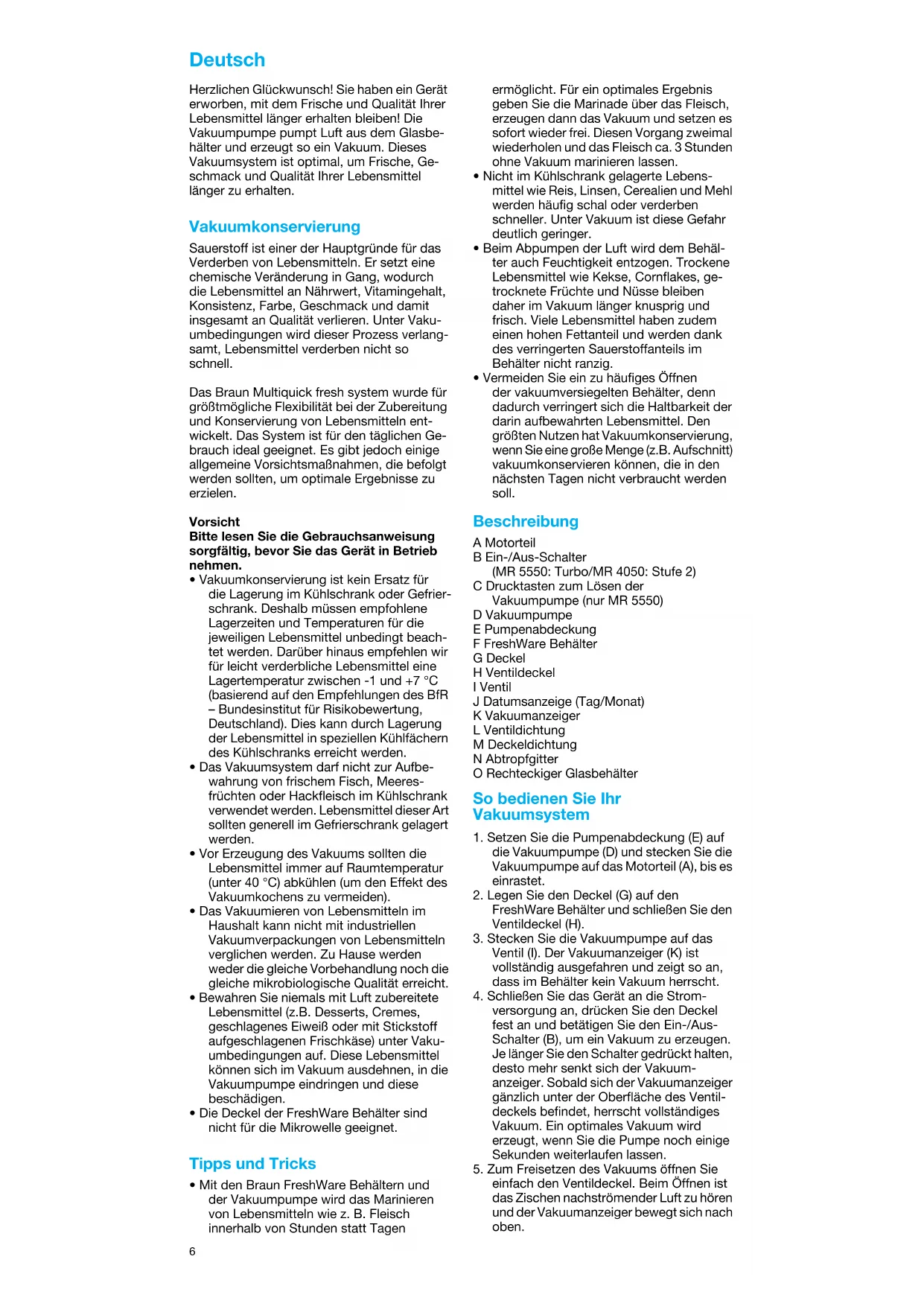4162355_DaVinci_S05 Seite 1 Dienstag, 28. November 2006 12:04 126 Deutsch Herzlichen Glückwunsch! Sie haben ein Gerät erworben, mit dem Frische und Qualität Ihrer Lebensmittel länger erhalten bleiben! Die Vakuumpumpe pumpt Luft aus dem Glasbe- hälter und erzeugt so ein Vakuum. Dieses Vakuumsystem ist optimal, um Frische, Ge- schmack und Qualität Ihrer Lebensmittel länger zu erhalten. Vakuumkonservierung Sauerstoff ist einer der Hauptgründe für das Verderben von Lebensmitteln. Er setzt eine chemische Veränderung in Gang, wodurch die Lebensmittel an Nährwert, Vitamingehalt, Konsistenz, Farbe, Geschmack und damit insgesamt an Qualität verlieren. Unter Vaku- umbedingungen wird dieser Prozess verlang- samt, Lebensmittel verderben nicht so schnell. Das Braun Multiquick fresh system wurde für größtmögliche Flexibilität bei der Zubereitung und Konservierung von Lebensmitteln ent- wickelt. Das System ist für den täglichen Ge- brauch ideal geeignet. Es gibt jedoch einige allgemeine Vorsichtsmaßnahmen, die befolgt werden sollten, um optimale Ergebnisse zu erzielen. Vorsicht Bitte lesen Sie die Gebrauchsanweisung sorgfältig, bevor Sie das Gerät in Betrieb nehmen.