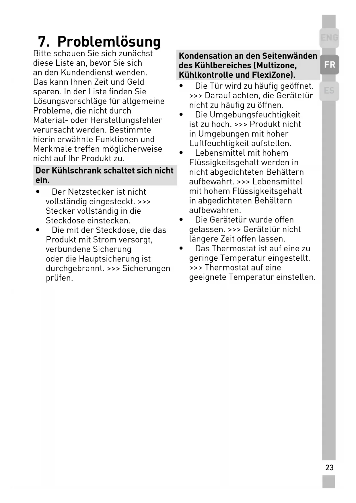 - Die mit der Steckdose, die das Produkt mit Strom versorgt, verbundene Sicherung oder die Hauptsicherung ist durchgebrannt. >>> Sicherungen prüfen. Kondensation an den Seitenwänden des Kühlbereiches )Multizone, Kühlkontrolle und FlexiZone(.