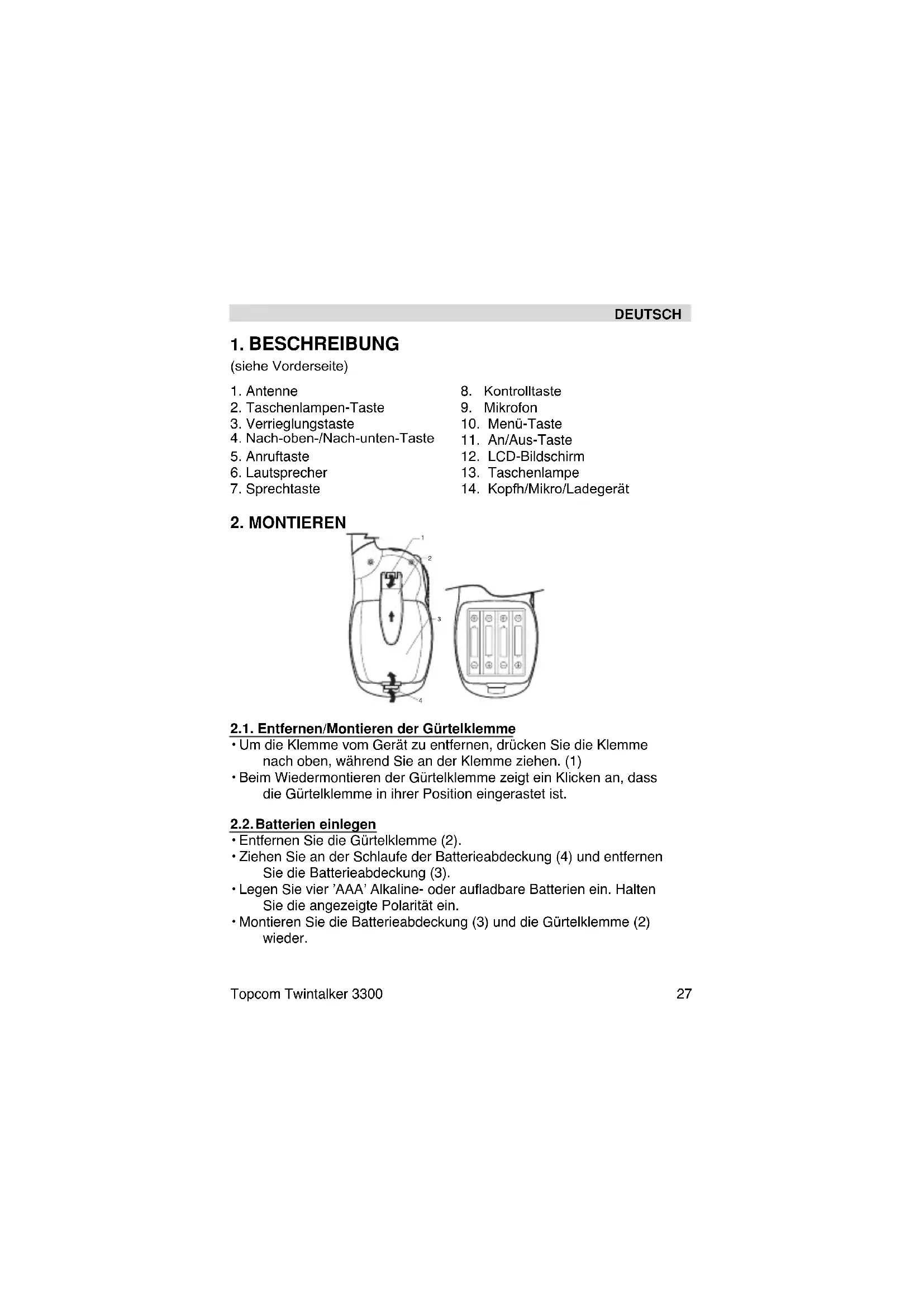 Taschenlampe Halten Sie die TASCHENLAMPEN-Taste gedrückt um das Licht zu anzuschalten.32 Topcom Twintalker 3300 DEUTSCH